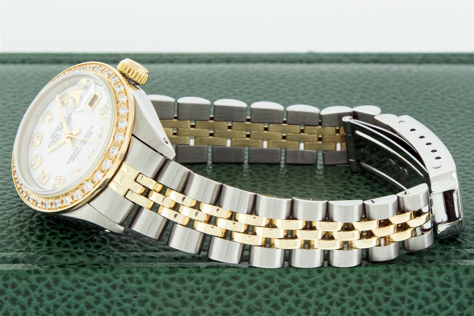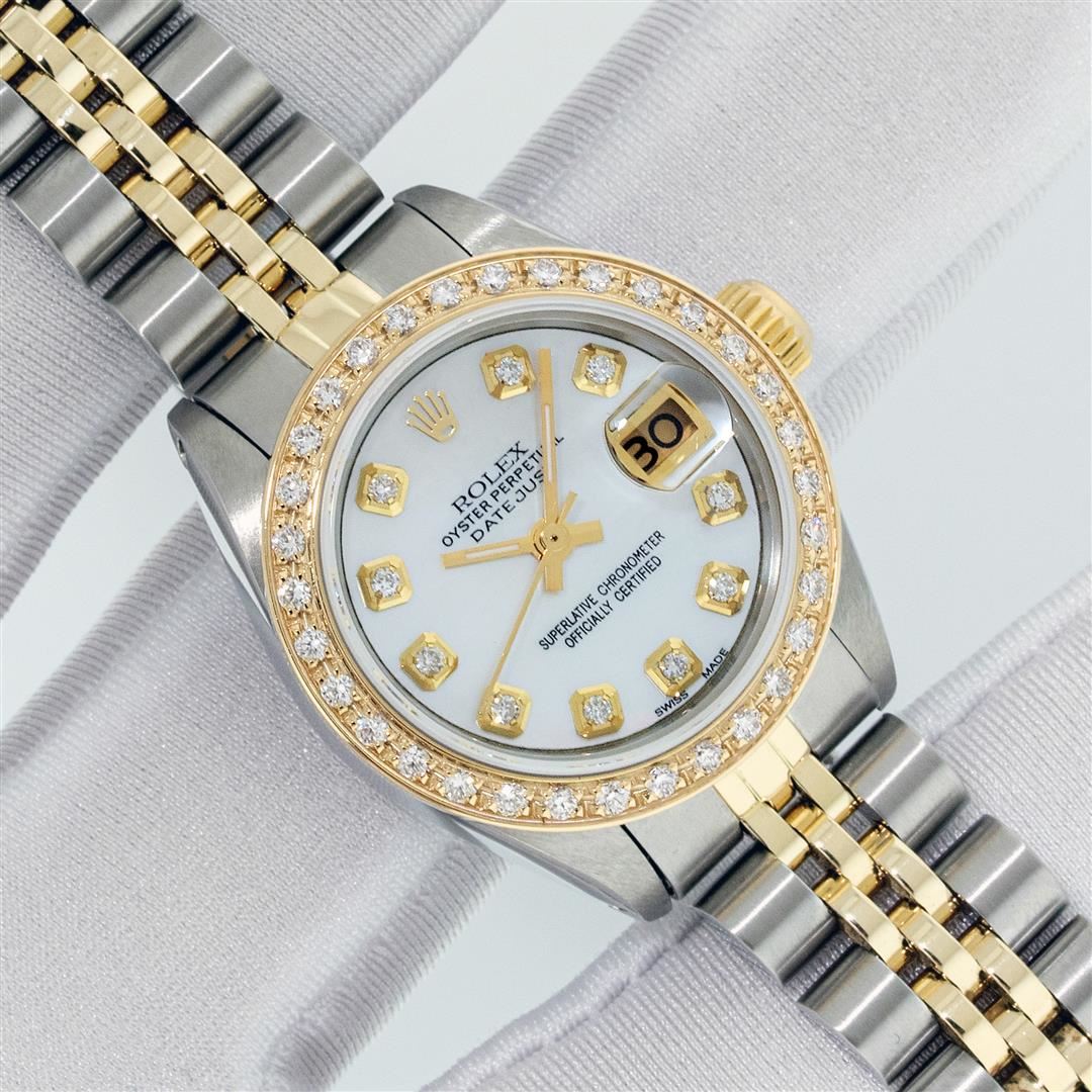 One Ladies Two Tone Rolex Datejust Polished, Serviced & Electronically Tested, Yellow Gold & Stainless Steel Case: 26mm, Yellow Gold Crown, Custom Bezel: 18K Yellow Gold Beadset Diamond Bezel, Diamond Count: 32 Diamonds Total Weight .70 Carat, Clarity: Si-VS, Color: G to H. Custom Crystal: Synthetic Sapphire Cyclops Lens. Custom Hands: New Luminescent Hands. Movement: Automatic Winding Movement. Caliber. Custom Dial: Mother Of Pearl Dial Set With Diamond Hour Markers, 10 Diamond in Dial G To H In Color, SI-VS Clarity. Date Window: 3 O'clock Position Date Display, Model: Datejust. Condition: G-6 Extra Fine. Bracelet: Two Tone Yellow Gold & Stainless Steel Jubilee. Bright Polish. 6.0 Inch Length, Adjustable. Standard Clasp, With Rolex Logo. This Watch Has Been Serviced Time Tested And Is In Excellent Condition It Is Free Of All Scratches And Dents.