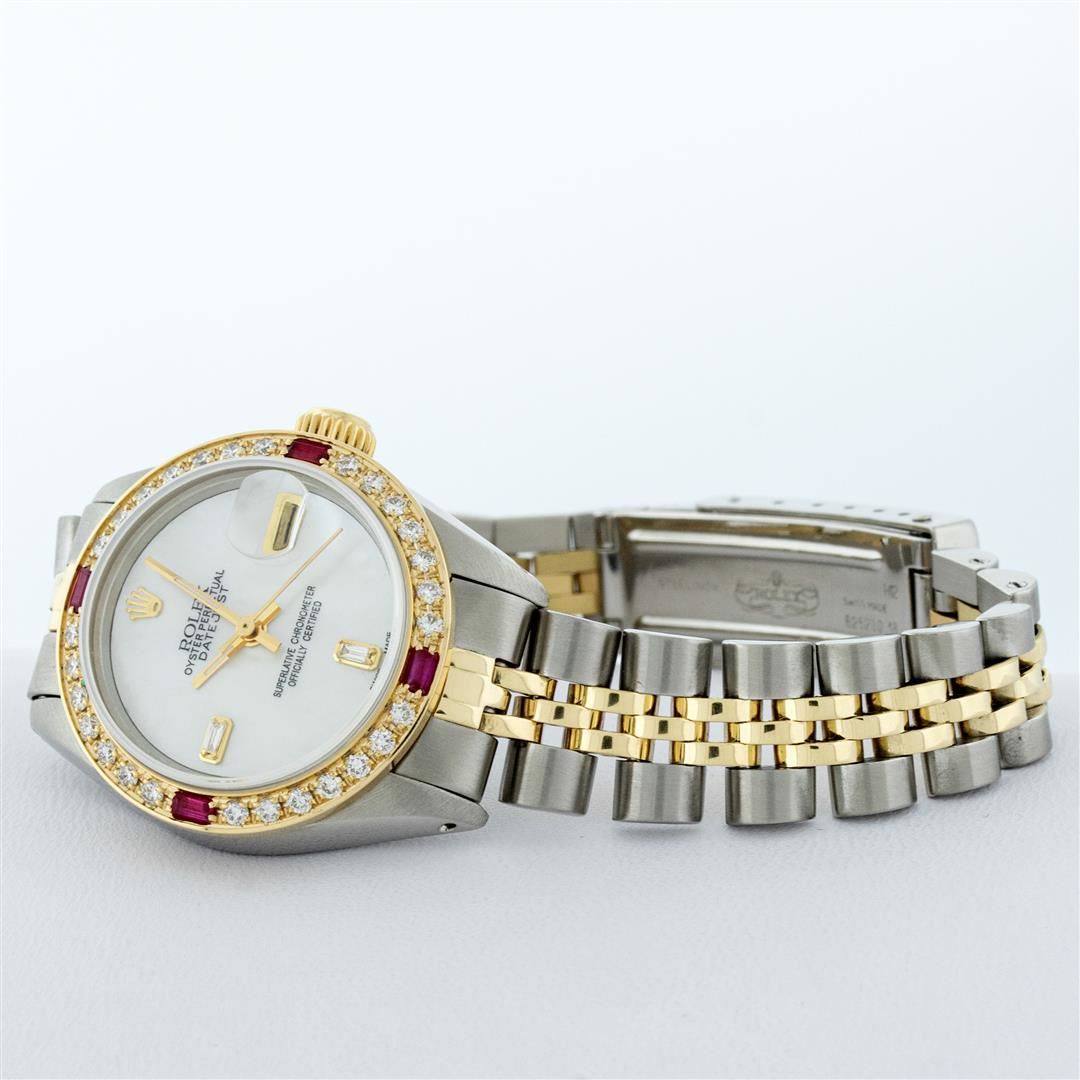 One Ladies Two Tone Rolex Datejust Polished, Serviced & Electronically Tested, Yellow Gold & Stainless Steel Case: 26mm, Yellow Gold Crown, Custom Bezel: New 18K Yellow Gold Ruby Beadset Diamond Bezel, Diamond Count: 28 Diamonds + 4 Sapphires In Bezel. Total Weight .70 Carat, Clarity: SI-VS, Color: G to H. Custom Crystal: New Scratch Resistant Synthetic Sapphire Cyclops Lens. Custom Hands: New Luminescent Hands. Movement: Automatic Winding Movement.. Custom Dial: Mother Of Pearl With Baguette Diamonds, Stone Count: 2 Baguettes. Date Window: 3 O'clock Position Date Display, Model: Datejust. Condition: G-6 Extra Fine. Bracelet: Two Tone Yellow Gold & Stainless Steel Jubilee Band. Bright Polish. 6.0 Inch Length, Adjustable. Standard Clasp, With Rolex Logo. This Watch Has Been Serviced Time Tested And Is In Excellent Condition It Is Free Of All Scratches And Dents.