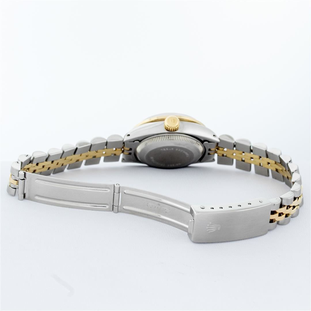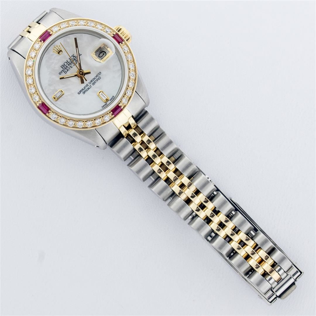 One Ladies Two Tone Rolex Datejust Polished, Serviced & Electronically Tested, Yellow Gold & Stainless Steel Case: 26mm, Yellow Gold Crown, Custom Bezel: New 18K Yellow Gold Ruby Beadset Diamond Bezel, Diamond Count: 28 Diamonds + 4 Sapphires In Bezel. Total Weight .70 Carat, Clarity: SI-VS, Color: G to H. Custom Crystal: New Scratch Resistant Synthetic Sapphire Cyclops Lens. Custom Hands: New Luminescent Hands. Movement: Automatic Winding Movement.. Custom Dial: Mother Of Pearl With Baguette Diamonds, Stone Count: 2 Baguettes. Date Window: 3 O'clock Position Date Display, Model: Datejust. Condition: G-6 Extra Fine. Bracelet: Two Tone Yellow Gold & Stainless Steel Jubilee Band. Bright Polish. 6.0 Inch Length, Adjustable. Standard Clasp, With Rolex Logo. This Watch Has Been Serviced Time Tested And Is In Excellent Condition It Is Free Of All Scratches And Dents.
