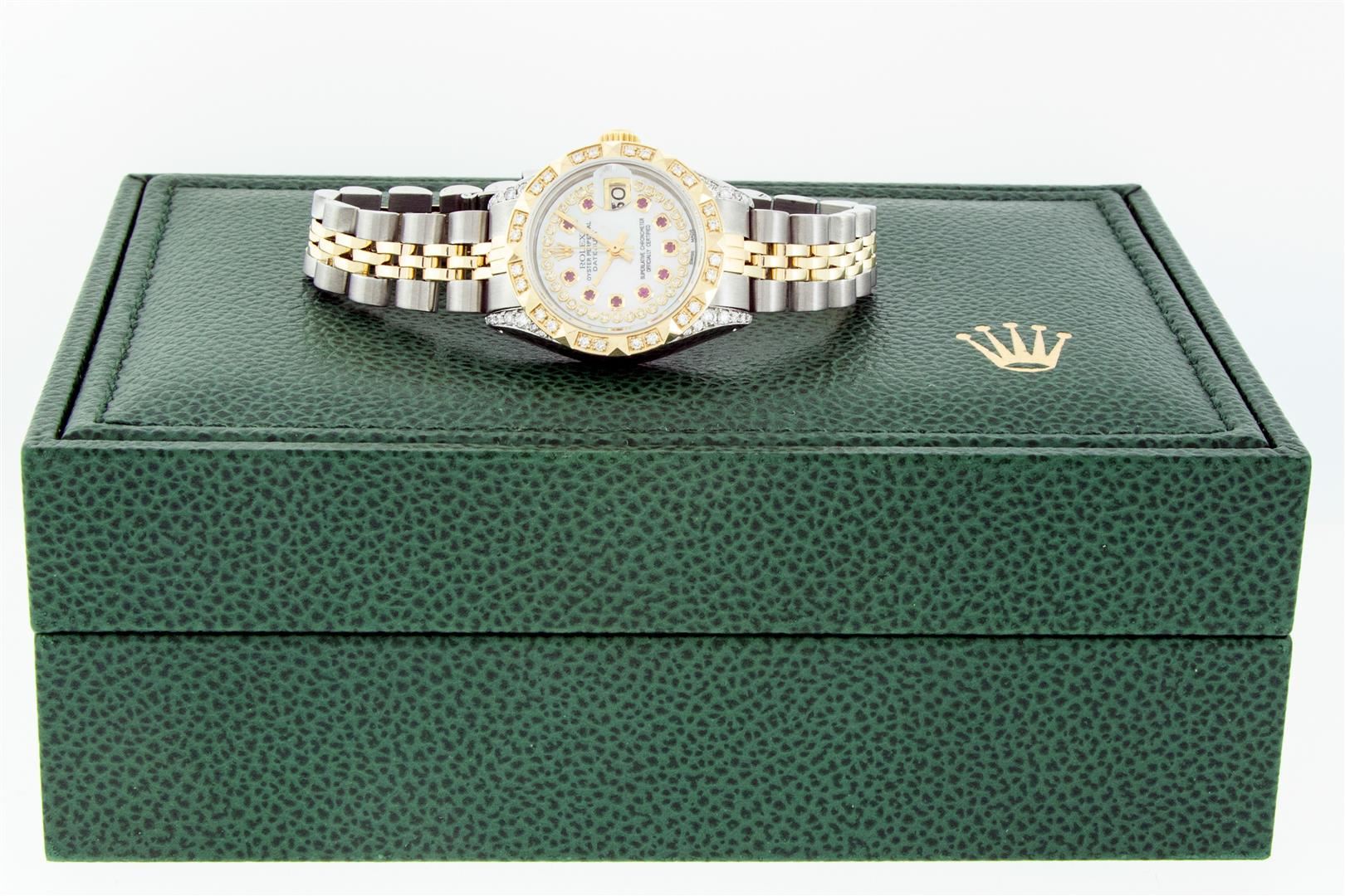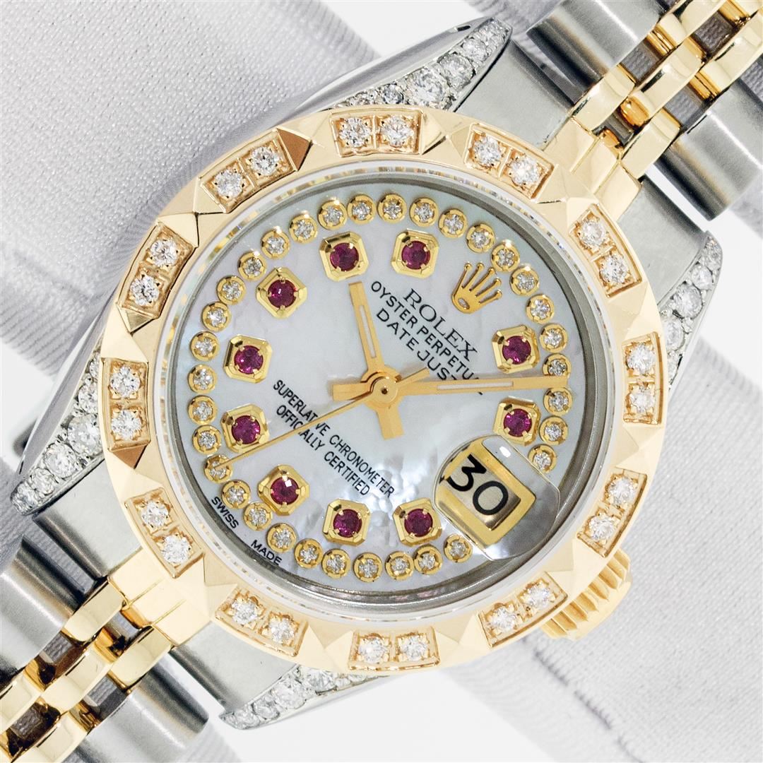 One Ladies Two Tone Rolex Datejust Polished, Serviced & Electronically Tested, Yellow Gold & Stainless Steel Case: 26mm, Yellow Gold Crown, Diamond Lugs: 24 Diamonds On Lugs, Clarity: SI-VS, Color: G to H, Clarity SI-VS. Custom Bezel: New 18K Yellow Gold Pyramid Diamond Bezel, Diamond Count: 24 Diamonds, Total Weight .50 Carat, Clarity: SI-VS, Color: G to H. Custom Crystal: New Synthetic Scratch Resistant Sapphire Cyclops Lens. Custom Hands: New Luminescent Hands. Movement: Automatic Winding Movement. Custom Dial: Mother Of Pearl With Ruby Hour Markers, Stone Count: 10 Rubies + 33 Diamonds In Dial, Clarity: SI-VS, Color: G to H. Date Window: 3 O'clock Position Date Display, Model: Datejust. Condition: G-6 Extra Fine. Bracelet: Two Tone Yellow Gold & Stainless Steel Jubilee. Bright Polish. 6.0 Inch Length, Adjustable. Standard Clasp, With Rolex Logo. This Watch Has Been Serviced Time Tested And Is In Excellent Condition It Is Free Of All Scratches And Dents. This Watch Comes With A Rolex Box.