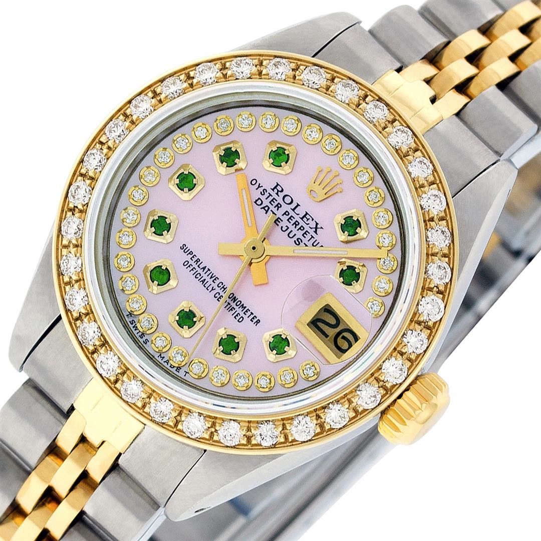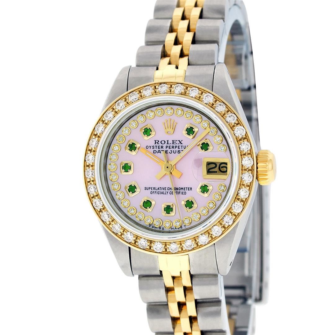 One Ladies Two Tone Rolex Datejust Polished, Serviced & Electronically Tested, Yellow Gold & Stainless Steel Case: 26mm, Yellow Gold Crown, Custom Bezel: New 18K Yellow Gold Beadset Diamond Bezel, Diamond Count: 43 Diamonds in bezel, Total Weight .70 Carat, Clarity: SI-VS, Color: G to H. Custom Crystal: New Synthetic Sapphire Cyclops Lens. Custom Hands: New Luminescent Hands. Movement: Automatic Winding Movement.. Custom Dial: Pink Mother Of Pearl String Diamond and Emerald Dial, Stone Count: 33 Diamonds + 10 Emerald, Clarity: SI-VS, Color: G to H. Date Window: 3 O'clock Position Date Display, Model: Datejust. Condition: G-6 Extra Fine. Bracelet: Two Tone Yellow Gold & Stainless Steel Jubilee Band. Bright Polish. 6.0 Inch Length, Adjustable. Standard Clasp, With Rolex Logo. This Watch Has Been Serviced Time Tested And Is In Excellent Condition It Is Free Of All Scratches And Dents.