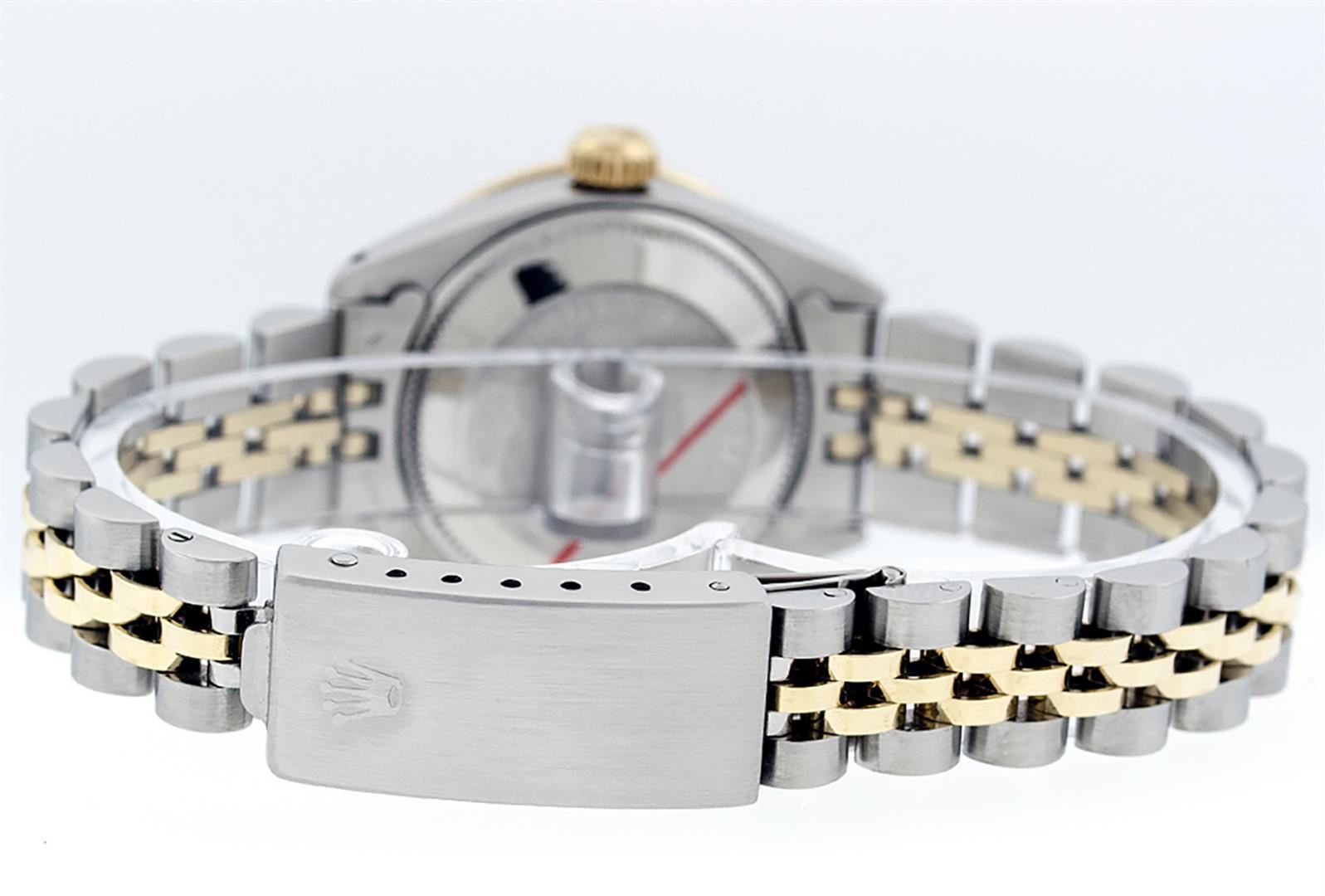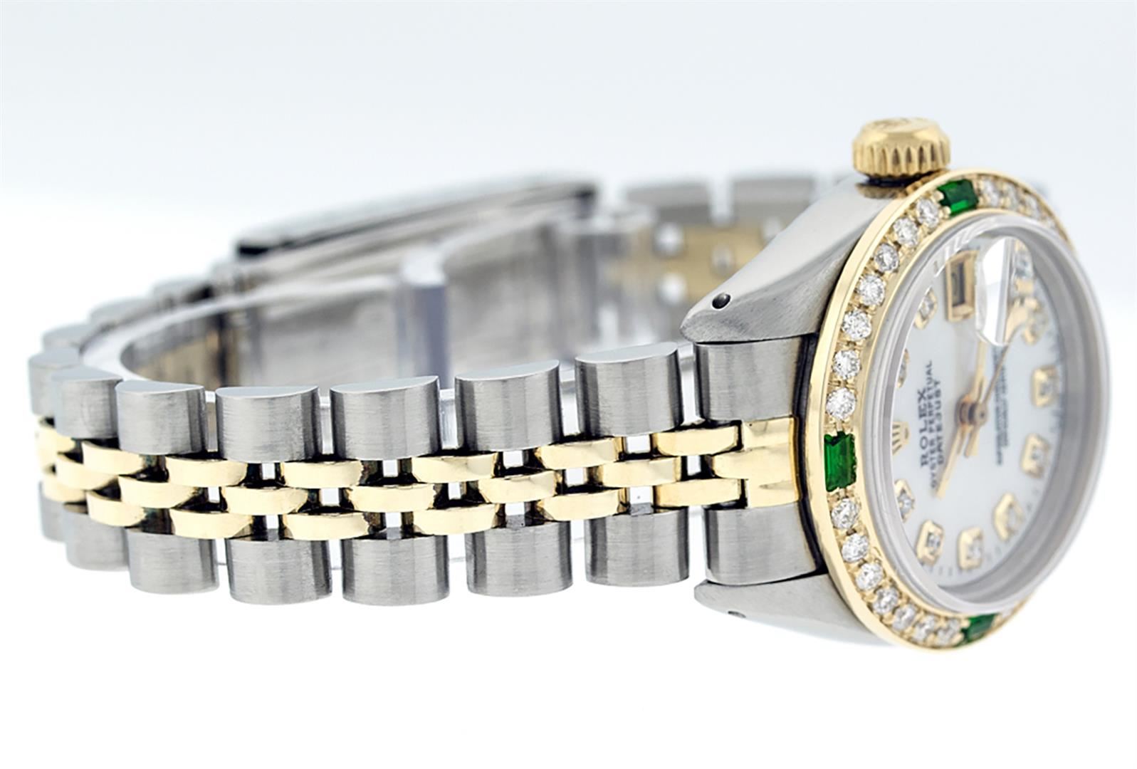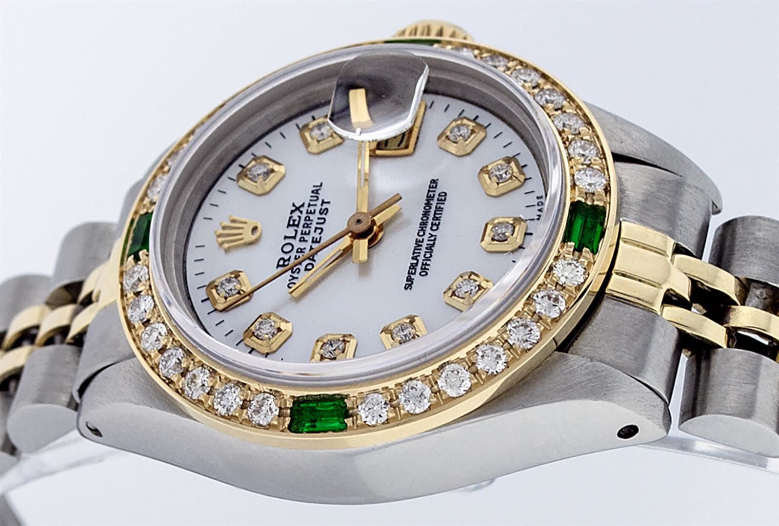 One Ladies 14K Two Tone Rolex Datejust Polished, Serviced & Electronically Tested, 14K Yellow Gold & Stainless Steel Case: 26mm, 14K Yellow Gold Crown, Custom Bezel: New 18K Yellow Gold Emerald Beadset Diamond Bezel, Diamond + Gem Count: 28 Diamonds + 4 Emeralds Total Weight .70 Carat, Clarity: SI-VS, Color: G to H. Custom Crystal: New Scratch Resistant Synthetic Sapphire Cyclops Lens. Custom Hands: New Luminescent Hands. Movement: Automatic Winding Movement Caliber 2030. Custom Dial: White Set With Diamond Hour Markers & Dash Track, Diamond Count: 10 Diamond in Dial, G To H In Color, SI-VS Clarity. Date Window: 3 O'Clock Position Date Display, Model: Datejust, Condition: G-6 Extra Fine. Bracelet: Two Tone 14K Yellow Gold & Stainless Steel Jubilee Band. Bright Polish. 6.0 Inch Length, Adjustable. Standard Clasp, With Rolex Logo. This Watch Has Been Serviced Time Tested And Is In Excellent Condition It Is Free Of All Scratches And Dents.