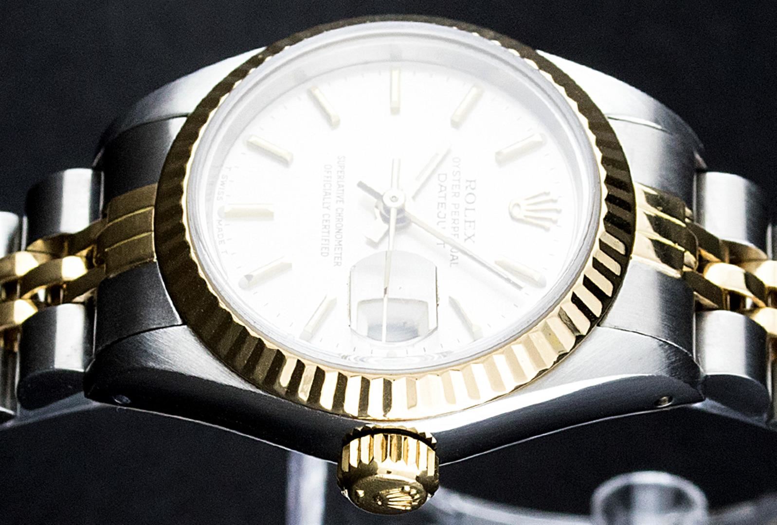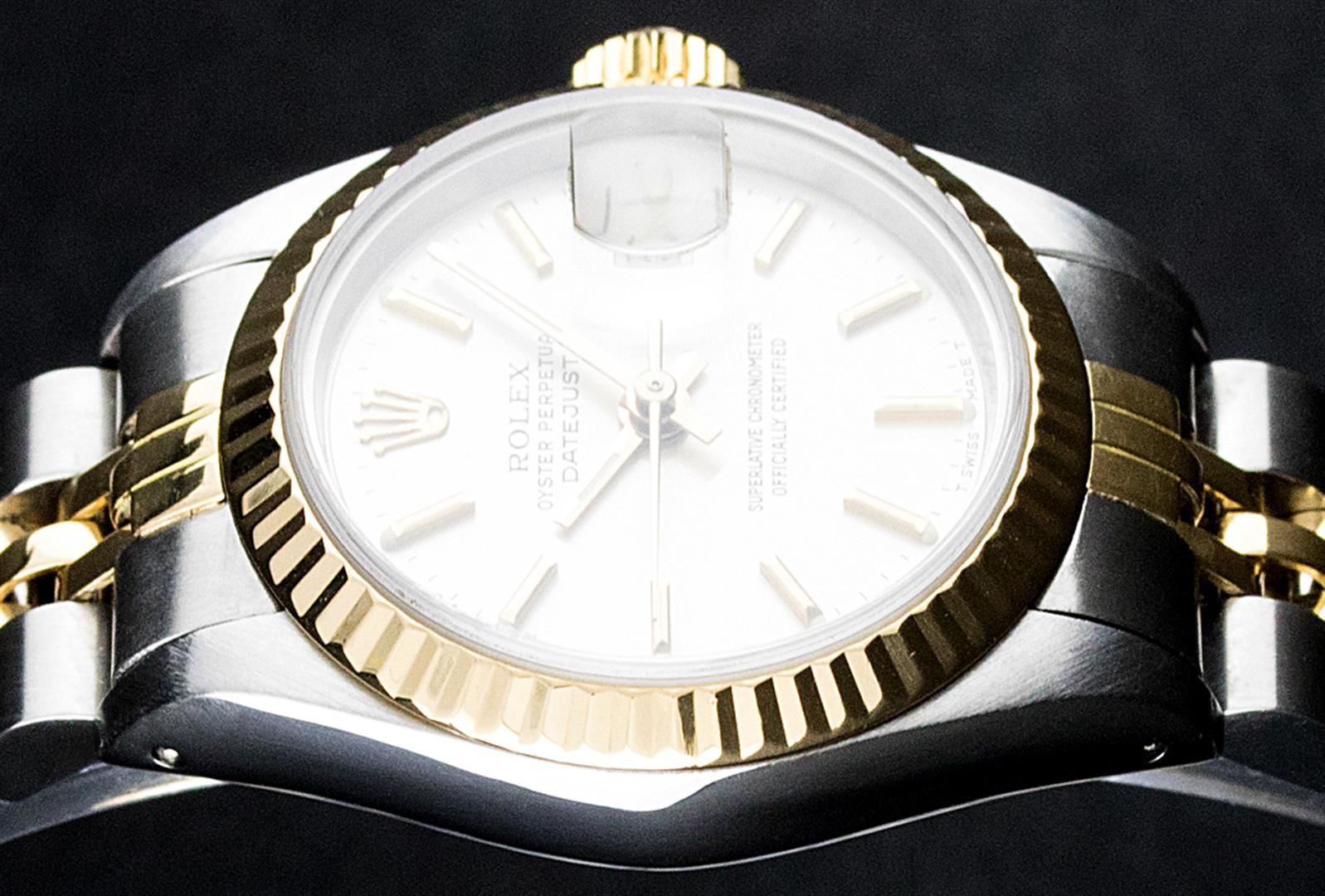 One Ladies Pre Owned Two Tone Rolex Datejust Polished, Serviced & Electronically Tested, Rolex Yellow Gold & Stainless Steel Case: 26mm, Rolex Yellow Gold Crown, Rolex Bezel: Yellow Gold Fluted Bezel. Custom Crystal: New Acrylic Cyclops Lens. Custom Hands: New Luminescent Hands. Rolex Movement: Automatic Winding Movement. Custom Dial: White Index With Dash Track. Date Window: 3 O'Clock Position Date Display, Model: Datejust. Condition: G-6 Extra Fine. Rolex Bracelet: Two Tone Yellow Gold & Stainless Steel Jubilee Band. Bright Polish. 6.0 Inch Length, Adjustable. Standard Clasp, With Rolex Logo. This Watch Has Been Serviced Time Tested And Is In Excellent Condition It Is Free Of All Scratches And Dents.