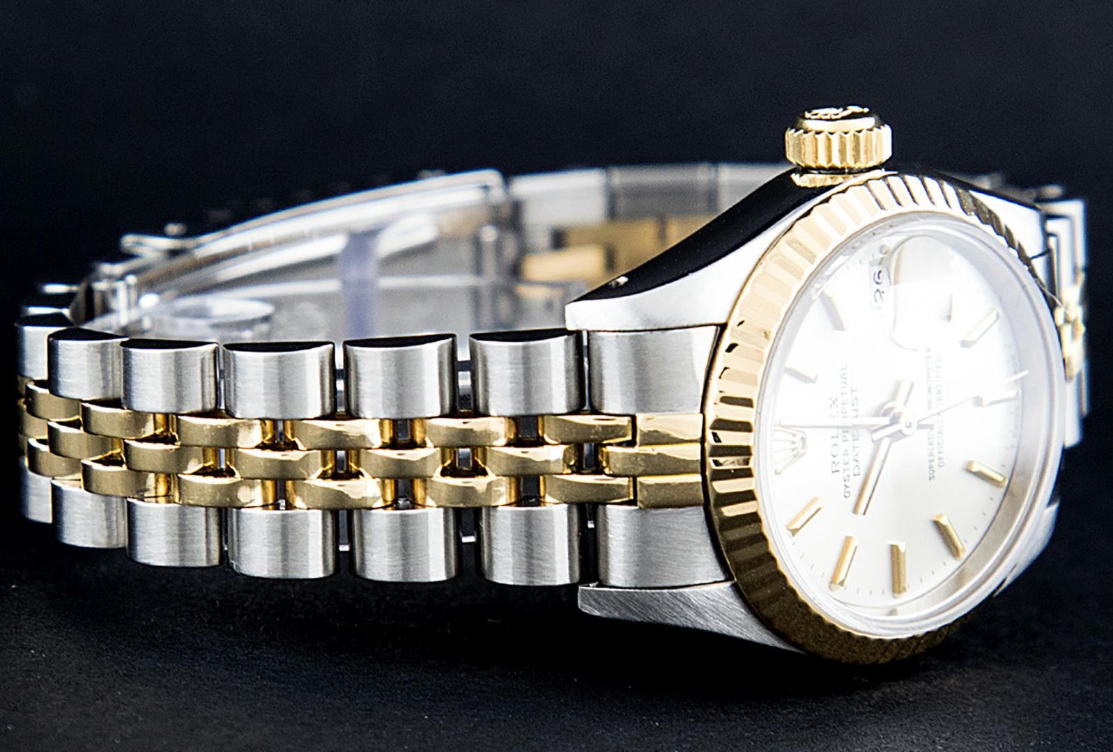 One Ladies Pre Owned Two Tone 14K Yellow Gold And Stainless Steel Rolex Polished, Serviced & Electronically Tested, Rolex Yellow Gold & Stainless Steel Case: 26mm, Rolex Yellow Gold Crown, Rolex Bezel: 14K Yellow Gold Fluted Bezel. Custom Crystal: New Plexiglass With Date Window. Hands: Luminescent Hands. Rolex Movement: Automatic Winding Movement 2030. Custom Dial: White Index With Dash Track. Date Window: 3 O'Clock Position Date Display, Model: Datejust. Condition: G-6 Extra Fine. Rolex Bracelet: Two Tone 14K Yellow Gold & Stainless Steel Jubilee Band. Bright Polish. 6.0 Inch Length, Adjustable. Standard Clasp, With Rolex Logo. This Watch Has Been Serviced Time Tested And Is In Excellent Condition It Is Free Of All Scratches And Dents.