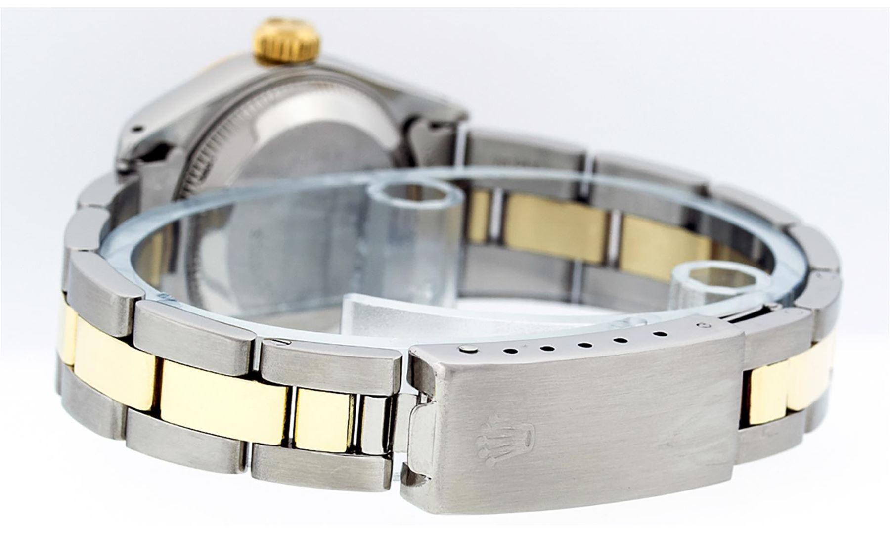 One Ladies Pre Owned Two Tone 14K Yellow Gold & Stainless Steel Rolex Polished, Serviced & Electronically Tested, Rolex 14K Yellow Gold & Stainless Steel Case: 26mm, Rolex Yellow Gold Crown, Rolex Bezel: 14K Yellow Gold Fluted Bezel. Custom Crystal: New Plexiglass With Date Window. Hands: Luminescent Hands. Rolex Movement: Automatic Winding Movement 2030. Rolex Dial: White With Dash Track & Lumi Dots. Date Window: 3 O'Clock Position Date Display, Model: Datejust. Condition: G-6 Extra Fine. Rolex Bracelet: Two Tone 14K Yellow Gold & Stainless Steel Oyster Band. Bright Polish. 6.0 Inch Length, Adjustable. Standard Clasp, With Rolex Logo. This Watch Has Been Serviced Time Tested And Is In Excellent Condition It Is Free Of All Scratches And Dents.