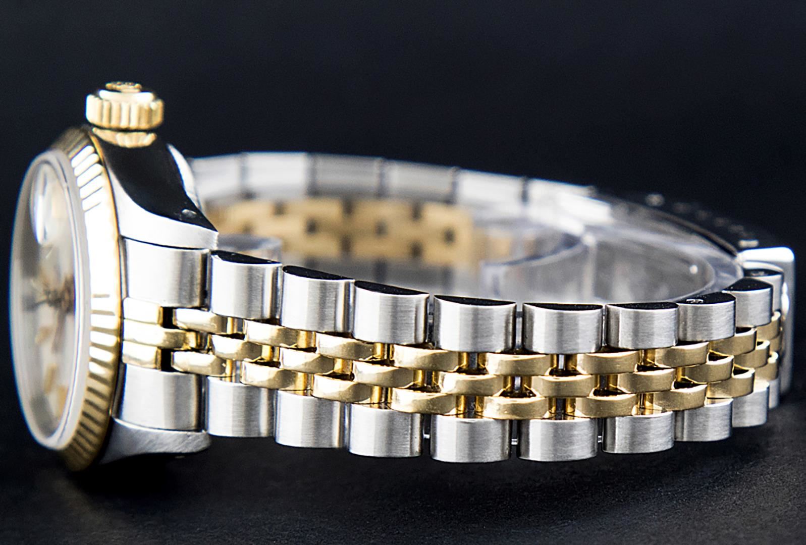 One Ladies Pre Owned Two Tone 14K Yellow Gold And Stainless Steel Rolex Polished, Serviced & Electronically Tested, Rolex Yellow Gold & Stainless Steel Case: 26mm, Rolex Yellow Gold Crown, Rolex Bezel: 14K Yellow Gold Fluted Bezel. Custom Crystal: New Plexiglass With Date Window. Hands: Luminescent Hands. Rolex Movement: Automatic Winding Movement 2030. Custom Dial: White Index With Dash Track. Date Window: 3 O'Clock Position Date Display, Model: Datejust. Condition: G-6 Extra Fine. Rolex Bracelet: Two Tone 14K Yellow Gold & Stainless Steel Jubilee Band. Bright Polish. 6.0 Inch Length, Adjustable. Standard Clasp, With Rolex Logo. This Watch Has Been Serviced Time Tested And Is In Excellent Condition It Is Free Of All Scratches And Dents.
