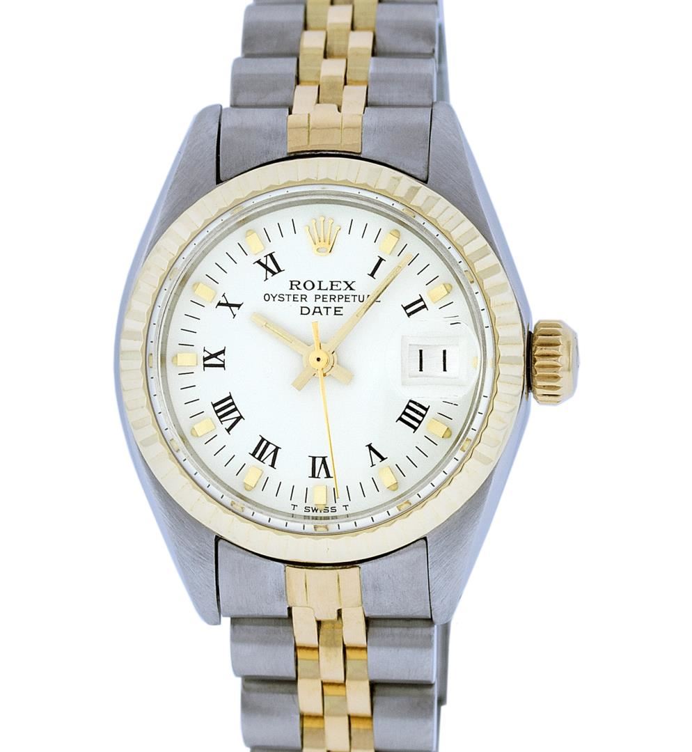 One Ladies Pre Owned Two Tone 14K Yellow Gold And Stainless Steel Rolex Polished, Serviced & Electronically Tested, Rolex 14K Yellow Gold & Stainless Steel Case: 26mm, Rolex Yellow Gold Crown, Rolex Bezel: 14K Yellow Gold Fluted Bezel. Custom Crystal: Plexiglass With Date Window. Hands: Luminescent Hands. Rolex Movement: Automatic Winding Movement 2030. Rolex Dial: White Index With Dash Track & Lumi Dots. Date Window: 3 O'Clock Position Date Display, Model: Datejust. Condition: G-6 Extra Fine. Rolex Bracelet: Two Tone 14K Yellow Gold & Stainless Steel Jubilee Band. Bright Polish. 6.0 Inch Length, Adjustable. Standard Clasp, With Rolex Logo. This Watch Has Been Serviced Time Tested And Is In Excellent Condition It Is Free Of All Scratches And Dents.