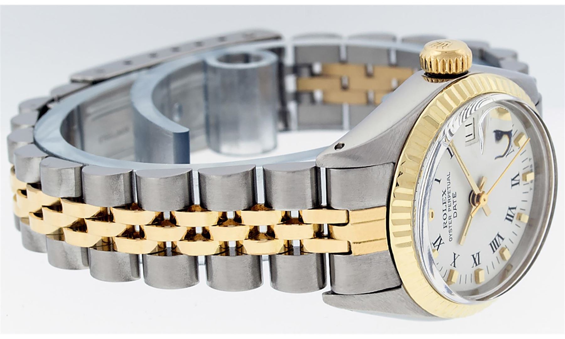 One Ladies Two Tone Rolex Datejust Polished, Serviced & Electronically Tested, Yellow Gold & Stainless Steel Case: 26mm, Yellow Gold Crown, Bezel: Yellow Gold Fluted Bezel. Custom Crystal: New Acrylic Cyclops Lens. Hands: Luminescent Hands. Movement: Auto