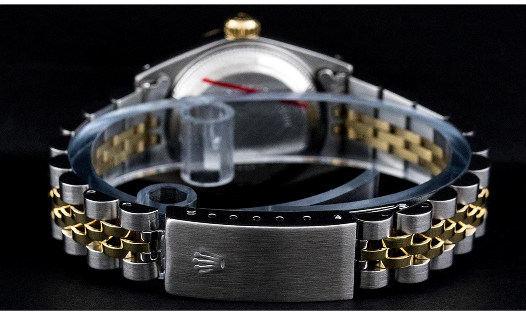 One Ladies Two Tone Rolex Datejust Polished, Serviced & Electronically Tested, Yellow Gold & Stainless Steel Case: 26mm, Yellow Gold Crown, Bezel: Yellow Gold Fluted Bezel. Custom Crystal: New Acrylic Cyclops Lens. Hands: Luminescent Hands. Movement: Auto