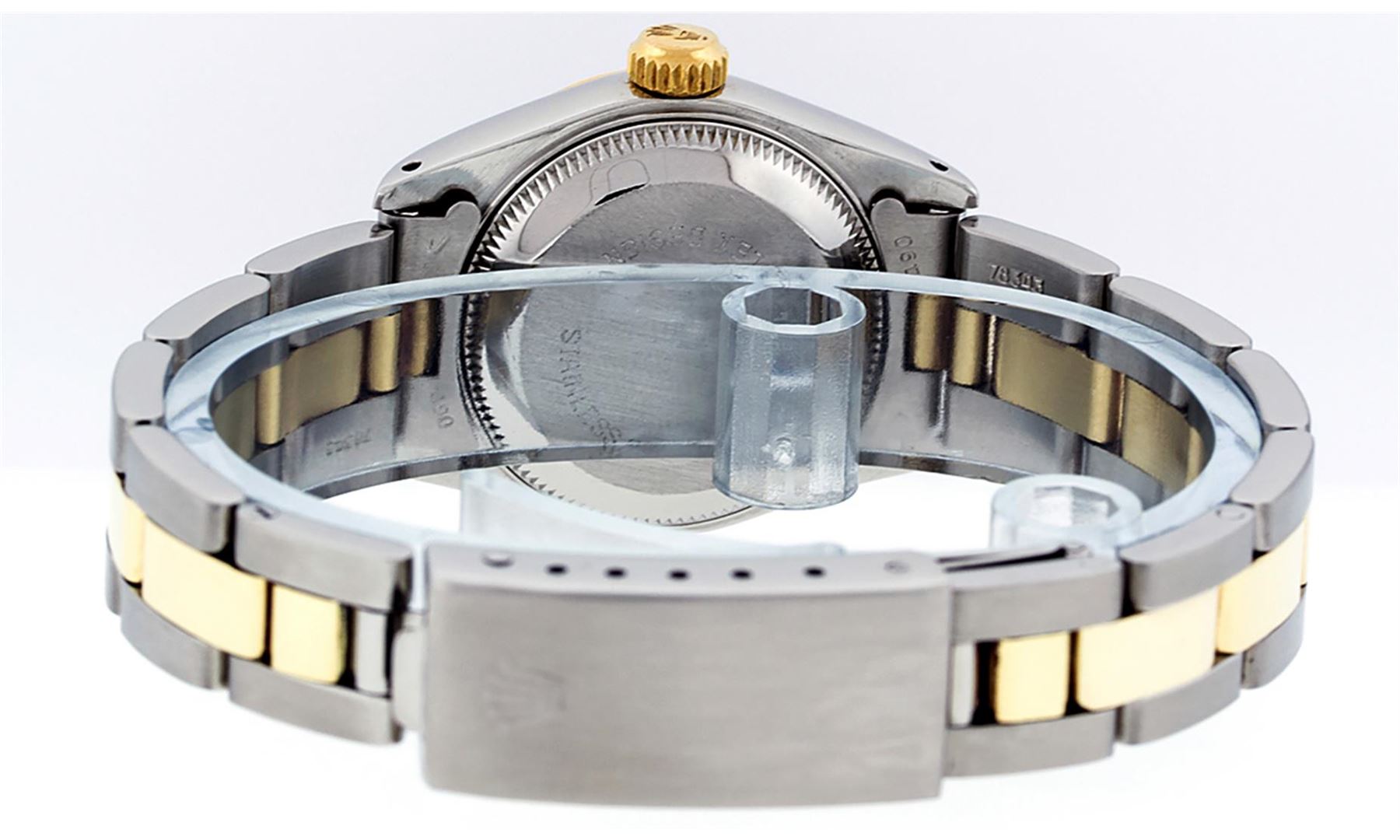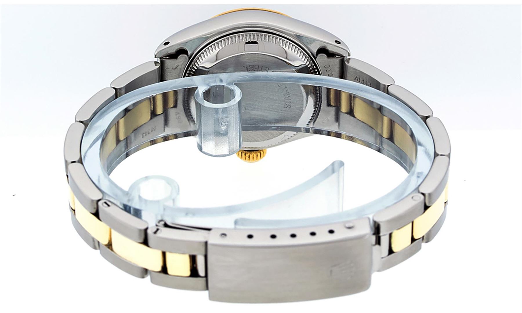 One Ladies Pre Owned Yellow Gold & Stainless Steel Two Tone Rolex Datejust Polished, Serviced & Electronically Tested, Rolex Yellow Gold & Stainless Steel Case: 26mm, Rolex Yellow Gold Crown, Rolex Bezel: Yellow Gold Fluted Bezel. Custom Crystal: New Acrylic Cyclops Lens. Hands: Luminescent Hands. Rolex Movement: Automatic Winding Movement. Rolex Dial: White Roman With Square Track. Date Window: 3 O'Clock Position Date Display, Model: Datejust. Condition: G-6 Extra Fine. Rolex Bracelet: Two Tone Yellow Gold & Stainless Steel Oyster Band. Bright Polish. 6.0 Inch Length, Adjustable. Standard Clasp, With Rolex Logo. This Watch Has Been Serviced Time Tested And Is In Excellent Condition It Is Free Of All Scratches And Dents.