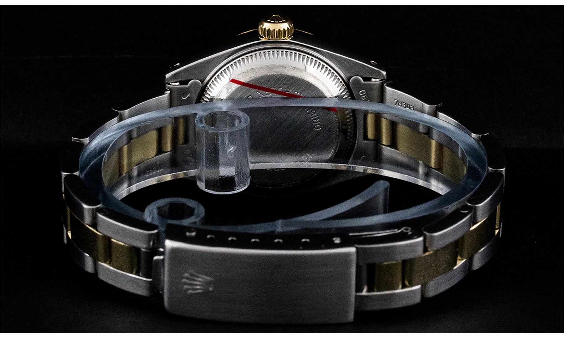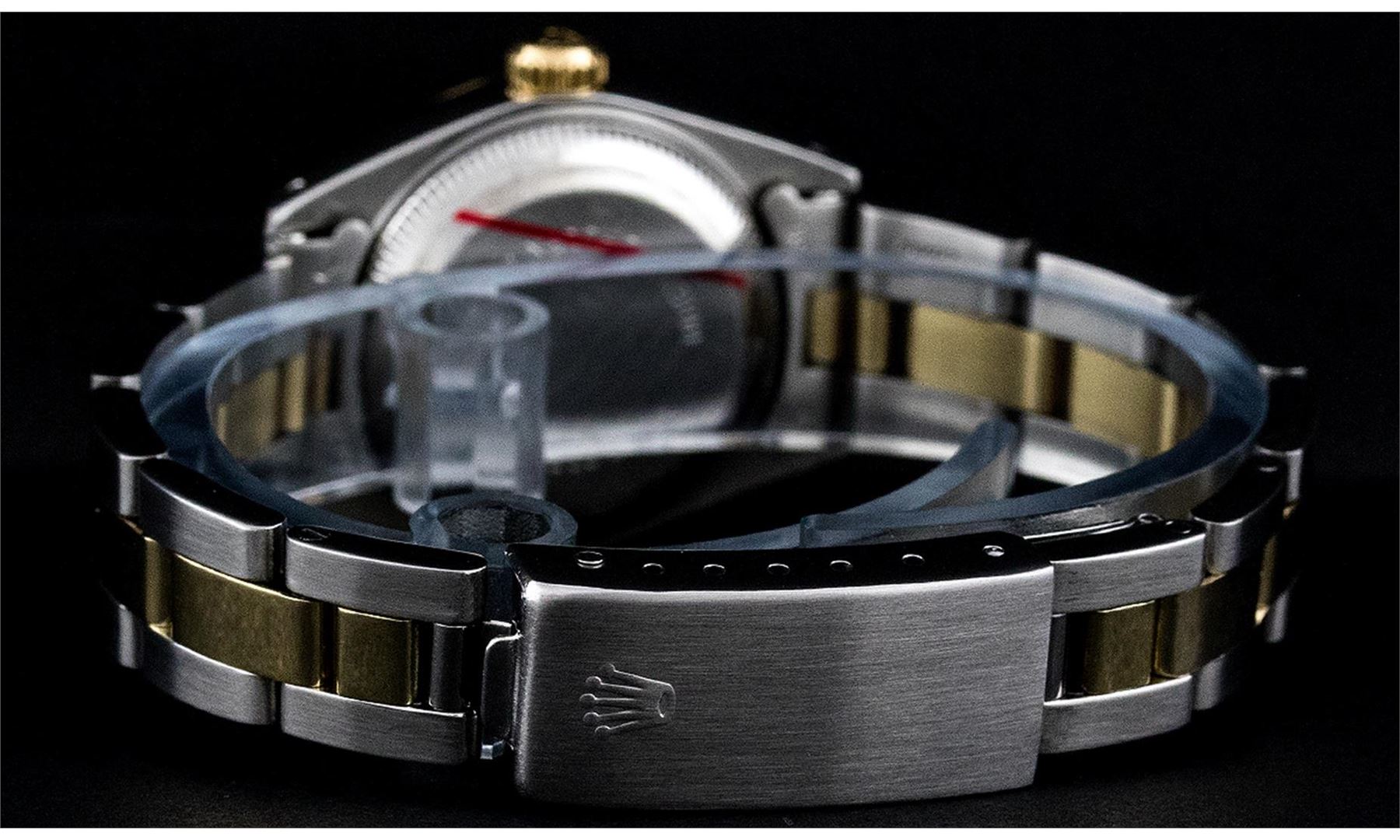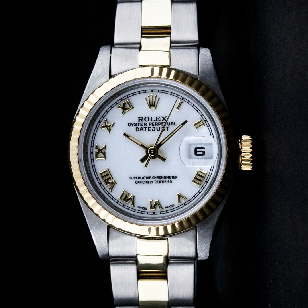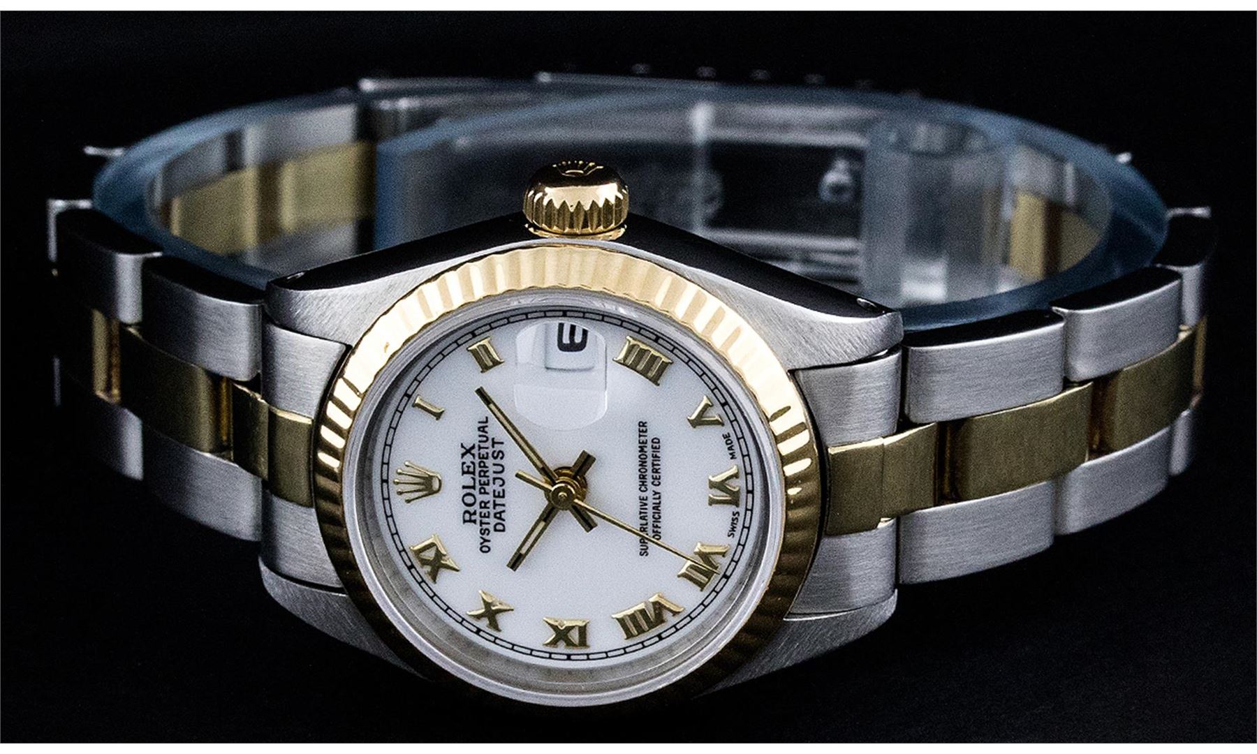 One Ladies Yellow Gold & Stainless Steel Two Tone Rolex Datejust Polished, Serviced & Electronically Tested, Yellow Gold & Stainless Steel Case: 26mm, Yellow Gold Crown, Bezel: Yellow Gold Fluted Bezel. Custom Crystal: New Acrylic Cyclops Lens. Hands: Lum
