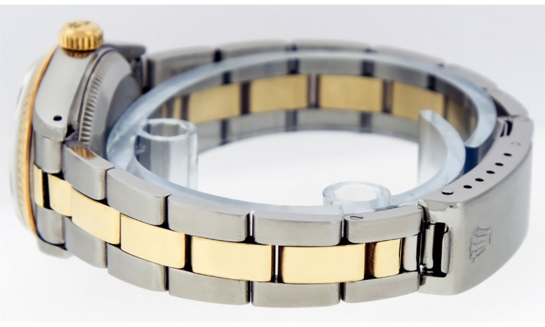 One Ladies Pre Owned 14K Yellow Gold & Stainless Steel Two Tone Rolex Polished, Serviced & Electronically Tested, Rolex Yellow Gold & Stainless Steel Case: 26mm, Rolex Yellow Gold Crown, Rolex Bezel: 14K Yellow Gold Fluted Bezel. Custom Crystal: New Plexiglass With Magnified Date Window. Custom Hands: New Luminescent Hands. Rolex Movement: Automatic Winding Movement 2030. Rolex Dial: White Roman With Square Track. Date Window: 3 O'Clock Position Date Display, Model: Datejust. Condition: G-6 Extra Fine. Rolex Bracelet: Two Tone 14K Yellow Gold & Stainless Steel Oyster Band. Bright Polish. 6.0 Inch Length, Adjustable. Standard Clasp, With Rolex Logo. This Watch Has Been Serviced Time Tested And Is In Excellent Condition It Is Free Of All Scratches And Dents.