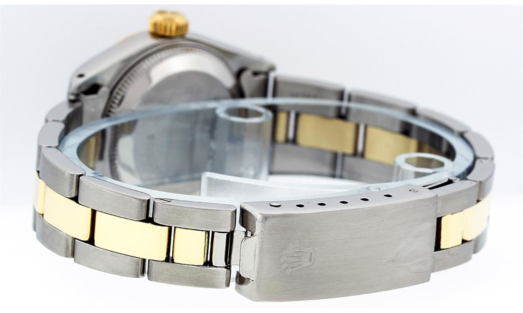 One Ladies Pre Owned 14K Yellow Gold & Stainless Steel Two Tone Rolex Polished, Serviced & Electronically Tested, Rolex Yellow Gold & Stainless Steel Case: 26mm, Rolex Yellow Gold Crown, Rolex Bezel: 14K Yellow Gold Fluted Bezel. Custom Crystal: New Plexiglass With Magnified Date Window. Custom Hands: New Luminescent Hands. Rolex Movement: Automatic Winding Movement 2030. Rolex Dial: White Roman With Square Track. Date Window: 3 O'Clock Position Date Display, Model: Datejust. Condition: G-6 Extra Fine. Rolex Bracelet: Two Tone 14K Yellow Gold & Stainless Steel Oyster Band. Bright Polish. 6.0 Inch Length, Adjustable. Standard Clasp, With Rolex Logo. This Watch Has Been Serviced Time Tested And Is In Excellent Condition It Is Free Of All Scratches And Dents.