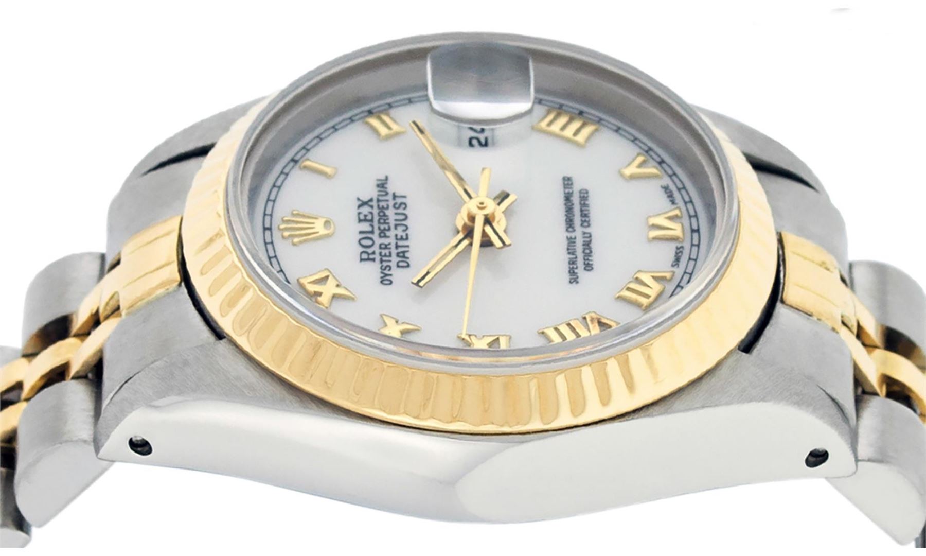 One Ladies Pre Owned Two Tone 14K Yellow Gold & Stainless Rolex Polished, Serviced & Electronically Tested, Rolex 14K Yellow Gold & Stainless Steel, Rolex Case Size: 26mm, Rolex Yellow Gold Crown, Rolex Bezel: 14K Yellow Gold Fluted Bezel. Crystal: Plexiglass With Magnified Date Window. Hands: Luminescent Hands. Rolex Movement: Automatic Winding Movement 2030. Rolex Dial: White Roman Dial With Square Track. Date Window: 3 O'Clock Position Date Display, Model: Datejust. Condition: G-6 Extra Fine. Rolex Bracelet: Two Tone 14K Yellow Gold & Stainless Steel Jubilee Band. Bright Polish. 6.0 Inch Length, Adjustable. Standard Clasp, With Rolex Logo. This Watch Has Been Serviced Time Tested And Is In Excellent Condition It Is Free Of All Scratches And Dents.