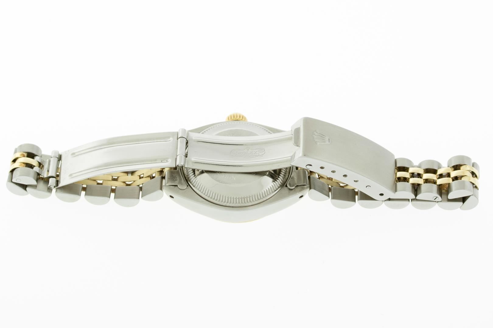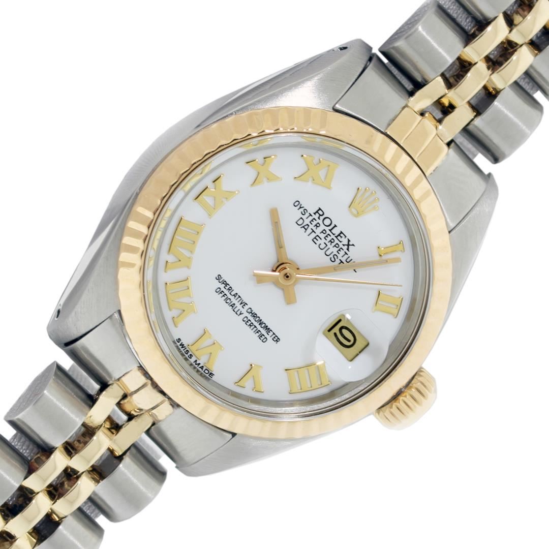 Rolex Ladies Pre Owned 18K Yellow Gold and Stainless Steel Two Tone Wristwatch Polished Bright with Satin Finish, Serviced & Electronically Tested, Rolex Stainless Steel Case: 26mm, Rolex Yellow Gold Crown, Rolex Bezel: Rolex 18K Yellow Gold Fluted Bezel. Crystal: Sapphire With Magnified Date Window. Hands: Non luminous hands. Rolex Movement: Quickset Automatic Winding Movement. Rolex Dial: White Dial With Roman Hour Markers, Date Window: 3 O'Clock Position Date Display, Model: Quickset Datejust, Condition: G-6 Extra Fine. Rolex Bracelet: Stainless Steel and 18K Yellow Gold Jubilee Band. Bright Polish & Satin Finish. 6.0 Inch Length, Adjustable. Standard Clasp, With Rolex Logo. This Watch Has Been Serviced Time Tested And Is In Excellent Condition It Is Free Of All Scratches And Dents.