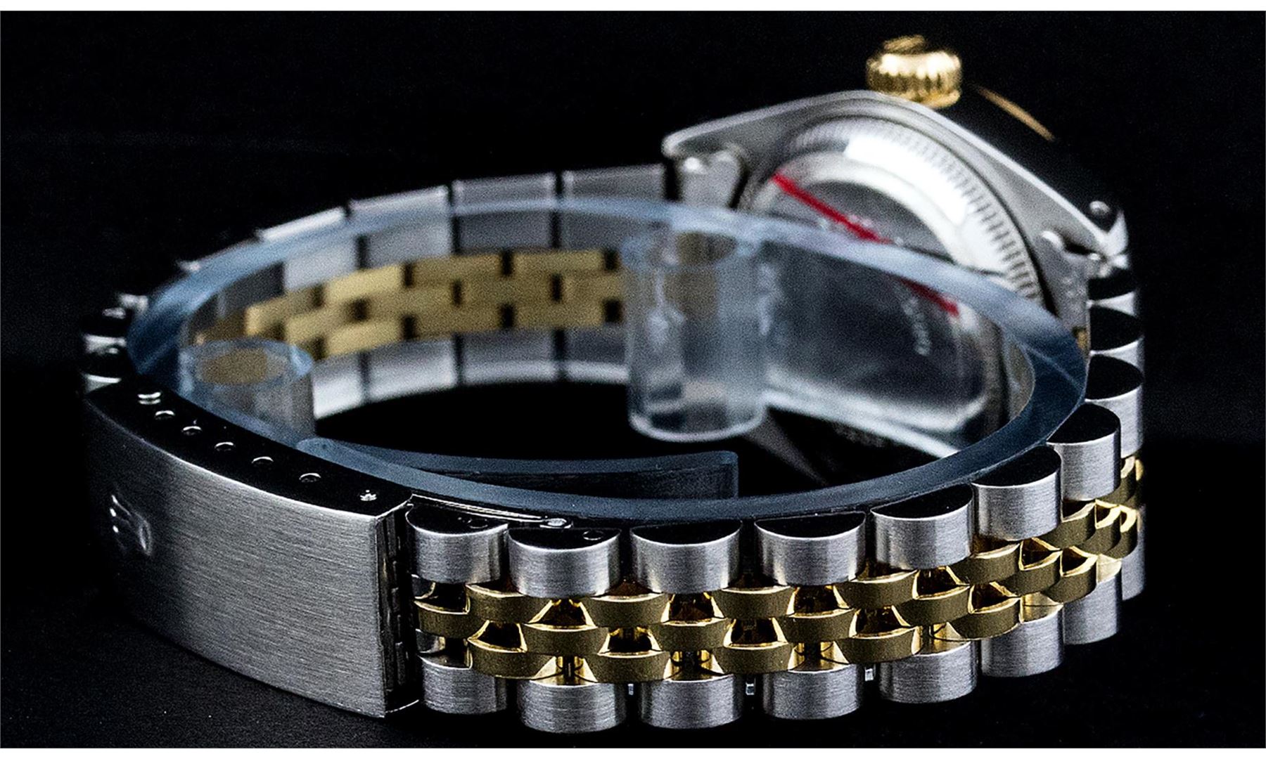 One Ladies Pre Owned Two Tone 14K Yellow Gold & Stainless Steel Rolex Datejust Polished, Serviced & Electronically Tested, Yellow Gold & Stainless Steel Case: 26mm, Yellow Gold Crown, Bezel: 14K Yellow Gold Fluted Bezel. Custom Crystal: New Plexiglass With Date Window. Hands: Luminescent Hands. Rolex Movement: Automatic Winding Movement 2030. Rolex Dial: White Roman With Square Track. Date Window: 3 O'Clock Position Date Display, Model: Datejust. Condition: G-6 Extra Fine. Bracelet: Two Tone 14K Yellow Gold & Stainless Steel Jubilee Band. Bright Polish. 6.0 Inch Length, Adjustable. Standard Clasp, With Rolex Logo. This Watch Has Been Serviced Time Tested And Is In Excellent Condition It Is Free Of All Scratches And Dents.