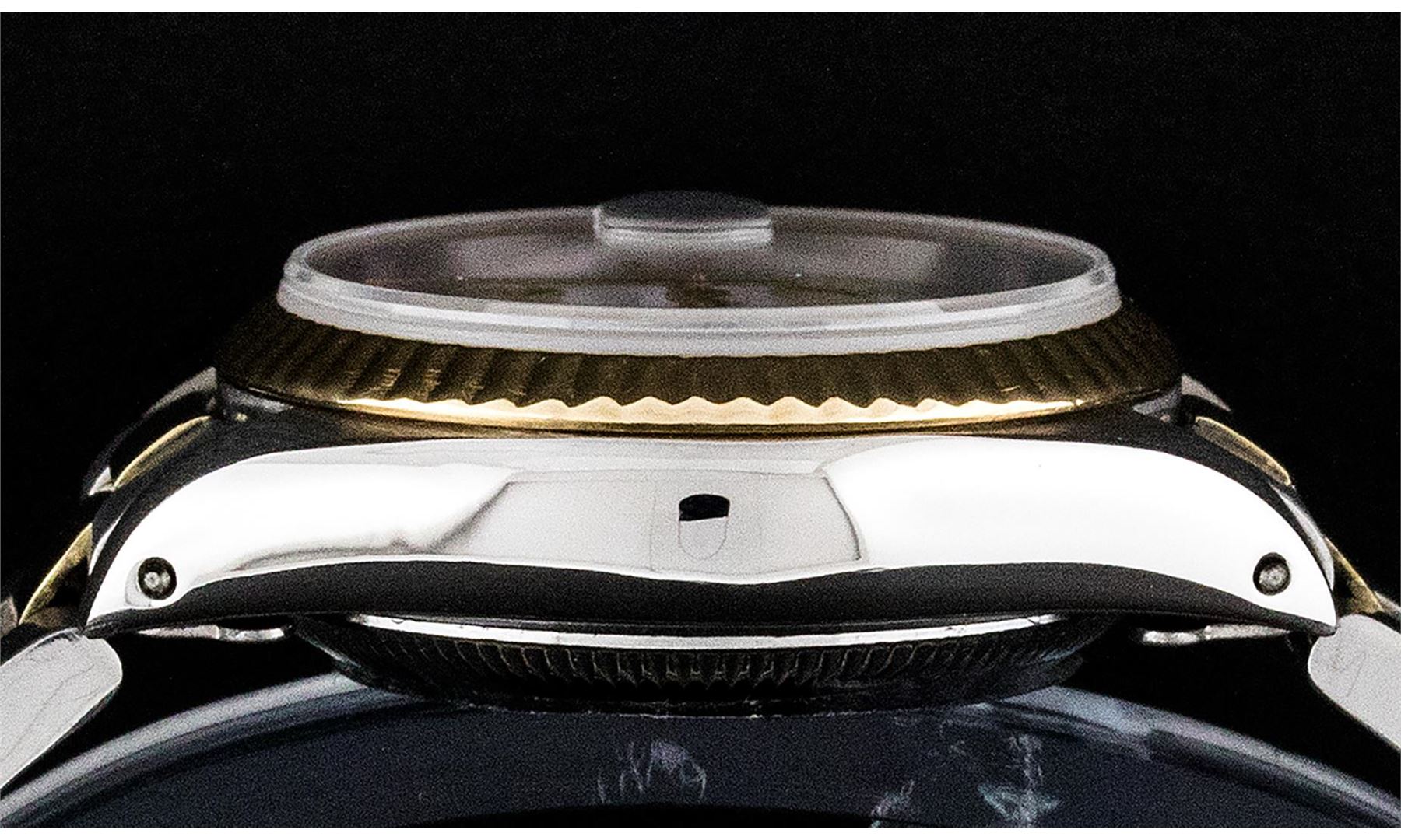 One Ladies Pre Owned Two Tone 14K Yellow Gold & Stainless Steel Rolex Datejust Polished, Serviced & Electronically Tested, Yellow Gold & Stainless Steel Case: 26mm, Yellow Gold Crown, Bezel: 14K Yellow Gold Fluted Bezel. Custom Crystal: New Plexiglass With Date Window. Hands: Luminescent Hands. Rolex Movement: Automatic Winding Movement 2030. Rolex Dial: White Roman With Square Track. Date Window: 3 O'Clock Position Date Display, Model: Datejust. Condition: G-6 Extra Fine. Bracelet: Two Tone 14K Yellow Gold & Stainless Steel Jubilee Band. Bright Polish. 6.0 Inch Length, Adjustable. Standard Clasp, With Rolex Logo. This Watch Has Been Serviced Time Tested And Is In Excellent Condition It Is Free Of All Scratches And Dents.