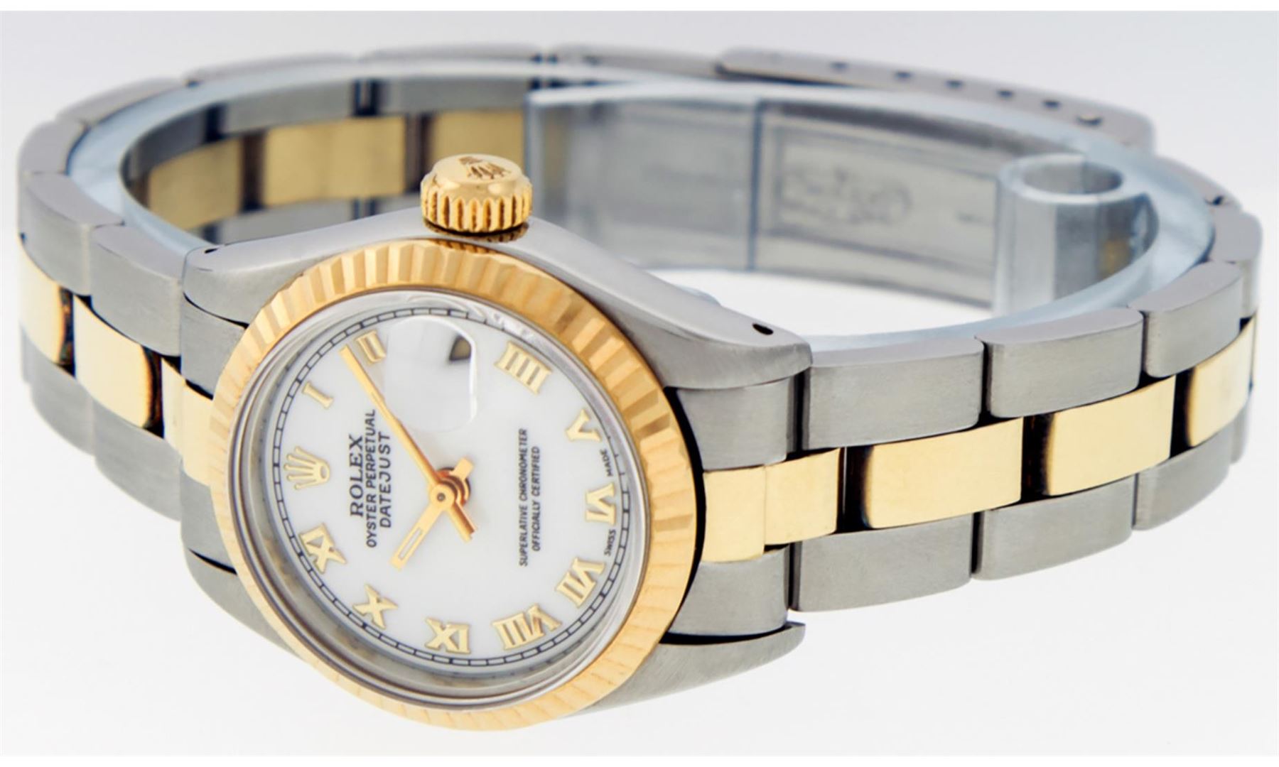 One Ladies Pre Owned 14K Yellow Gold & Stainless Steel Two Tone Rolex Polished, Serviced & Electronically Tested, Rolex Yellow Gold & Stainless Steel Case: 26mm, Rolex Yellow Gold Crown, Rolex Bezel: 14K Yellow Gold Fluted Bezel. Custom Crystal: New Plexiglass With Magnified Date Window. Custom Hands: New Luminescent Hands. Rolex Movement: Automatic Winding Movement 2030. Rolex Dial: White Roman With Square Track. Date Window: 3 O'Clock Position Date Display, Model: Datejust. Condition: G-6 Extra Fine. Rolex Bracelet: Two Tone 14K Yellow Gold & Stainless Steel Oyster Band. Bright Polish. 6.0 Inch Length, Adjustable. Standard Clasp, With Rolex Logo. This Watch Has Been Serviced Time Tested And Is In Excellent Condition It Is Free Of All Scratches And Dents.
