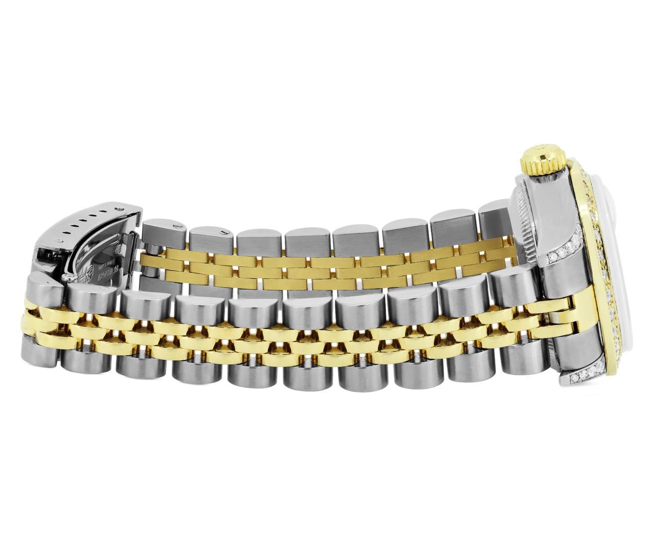 One Rolex Ladies Pre Owned Sapphire Two Tone 18K Yellow Gold And Stainless Steel Rolex Datejust Polished, Serviced And Electronically Tested, Rolex Yellow Gold And Stainless Steel Case: 26mm, Custom Diamond Lugs: 24 Added Diamonds On Lugs. Rolex Yellow Gold Crown. Custom Bezel: New 18K Yellow Gold Beadset Diamond Bezel, Diamond Count: 32 Diamonds On Bezel. Crystal: Sapphire Crystal With Date Window. Hands: Custom Hands: New Luminescent Hands. Rolex Movement: Automatic Winding Movement 2235. Rolex Factory Dial: White With Roman Markers And Square Track. Date Window: 3 O'clock Position Date Display, Condition: G-6 Extra Fine. Rolex Bracelet: Two Tone 18K Yellow Gold And Stainless Steel Jubilee Band. Bright Polish & Satin Finish. 6.0 Inch Length, Adjustable. Standard Clasp, With Rolex Logo. This Watch Has Been Serviced And Time Tested. It Is In Excellent Condition, Free Of All Scratches And Dents. This Watch Comes With A Rolex Box.