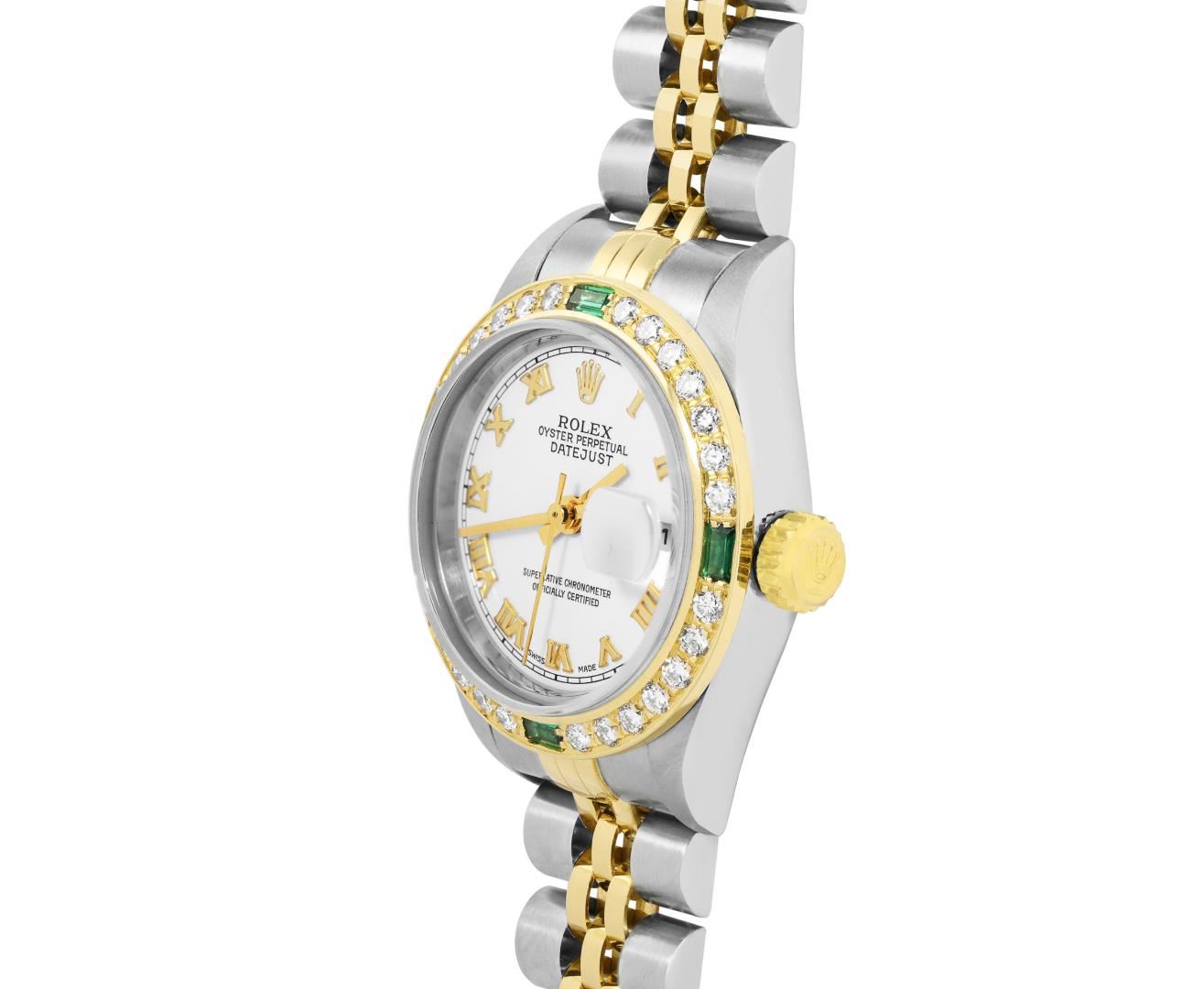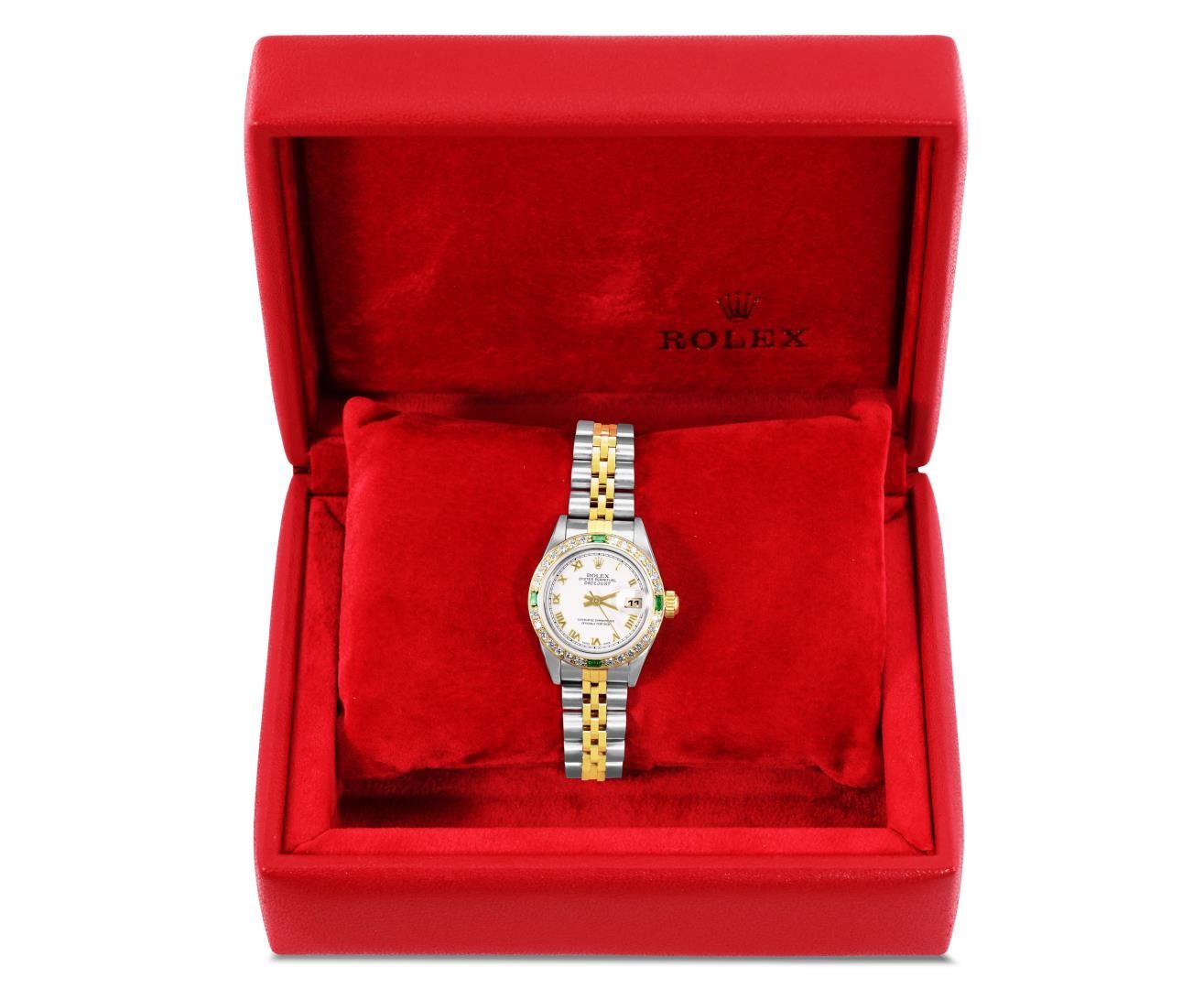 One Ladies Pre Owned Quickset Two Tone 18K Yellow Gold And Stainless Steel Rolex Datejust Polished Bright with Satin Finish, Serviced And Electronically Tested, Rolex Stainless Steel Case: 26mm, Rolex Yellow Gold Crown, Custom Bezel: New 18K Yellow Gold Diamond And Emerald Bezel, Stone Count: 28 Diamonds + 4 Emeralds On Bezel. Crystal: Sapphire With Magnified Date Window. Custom Hands: New Solid Hands. Rolex Movement: Automatic Winding Movement 2235. Rolex Dial: White with Roman Hour Markers and Square Track. Date Window: 3 O'Clock Position Date Display, Model: Quickset Datejust. Condition: G-6 Extra Fine. Rolex Bracelet: 18K Yellow Gold And Stainless Steel Jubilee Band. Bright Polish And Satin Finish. 6.0 Inch Length, Adjustable. Standard Clap, With Rolex Logo. This Watch Has Been Serviced Time Tested And Is In Excellent Condition It Is Free Of All Scratches And Dents. This Watch Comes With A Rolex Box.