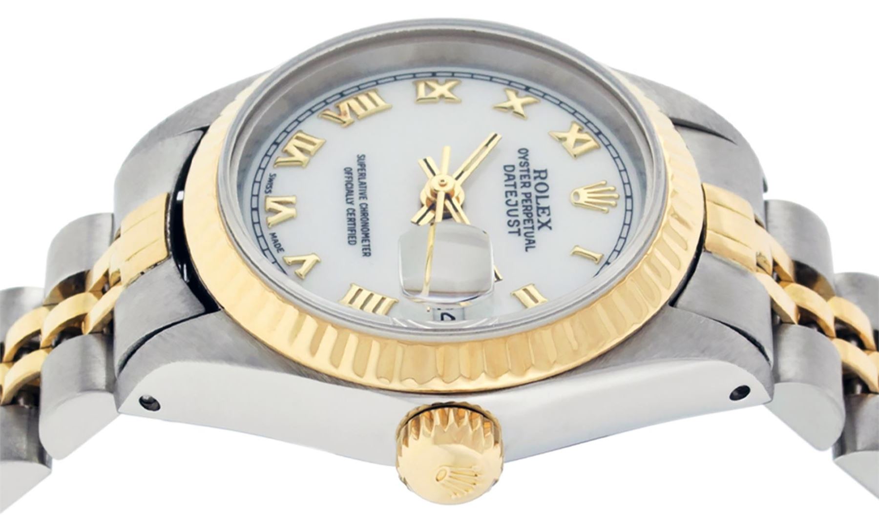 One Ladies Pre Owned Two Tone Yellow Gold & Stainless Rolex Polished, Serviced & Electronically Tested, Rolex Yellow Gold & Stainless Steel, Rolex Case Size: 26mm, Rolex Yellow Gold Crown, Rolex Bezel: Yellow Gold Fluted Bezel. Crystal: Plexiglass With Magnified Date Window. Custom Hands: New Luminescent Hands. Rolex Movement: Automatic Winding Movement 2030. Rolex Dial: White Roman Dial With Square Track. Date Window: 3 O'Clock Position Date Display, Model: Datejust. Condition: G-6 Extra Fine. Rolex Bracelet: Two Tone Yellow Gold & Stainless Steel Jubilee Band. Bright Polish. 6.0 Inch Length, Adjustable. Standard Clasp, With Rolex Logo. This Watch Has Been Serviced Time Tested And Is In Excellent Condition It Is Free Of All Scratches And Dents.