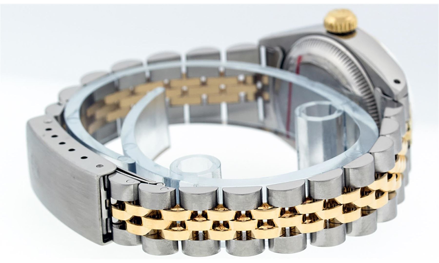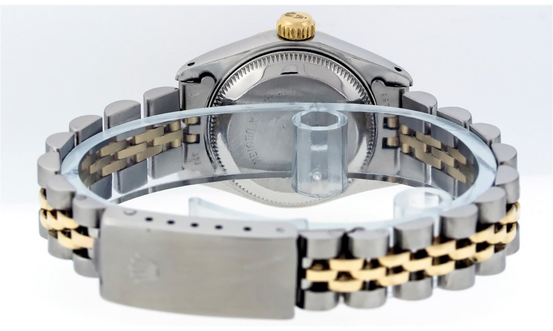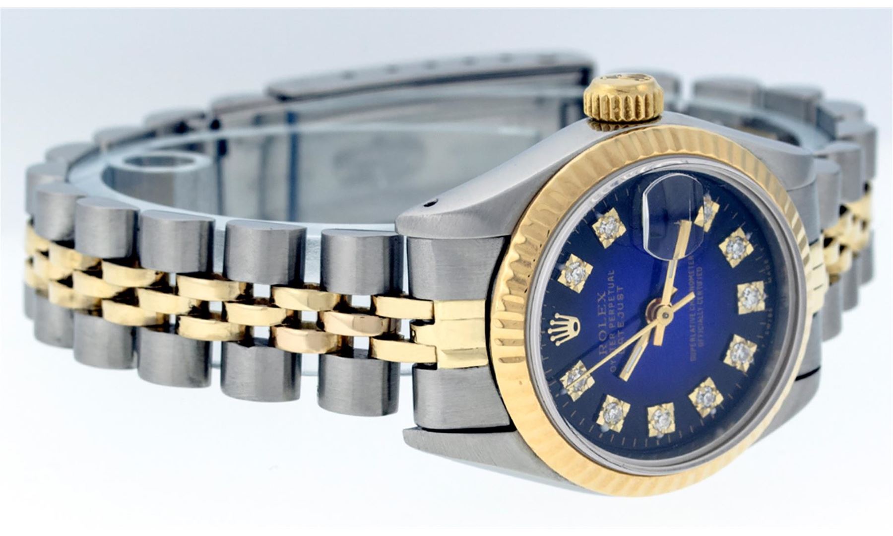 One Ladies Two Tone Rolex Datejust Polished, Serviced & Electronically Tested, 14K Yellow Gold & Stainless Steel Case:26mm, 14K Yellow Gold Crown, Bezel: 14K Yellow Gold Fluted Bezel. Custom Crystal: Acrylic Cyclops Lens. Movement: Automatic Winding Movement Caliber 2030. Custom Dial: Blue Vignette With VS Diamond Hour Markers, Diamond Count: 10 Diamonds In Dial, Color: G to H, Clarity: VS. Date Window: 3 O'Clock Position Date Display, Model: Datejust, Condition: G-6 Extra Fine. Bracelet: Two Tone 14K Yellow Gold & Stainless Steel Jubilee. Bright Polish. 5.5 Inch Length, Adjustable. Standard Clasp, With Rolex Logo. Watch Has Been Serviced And Polished It Is Free Of All Scratches And Dents.