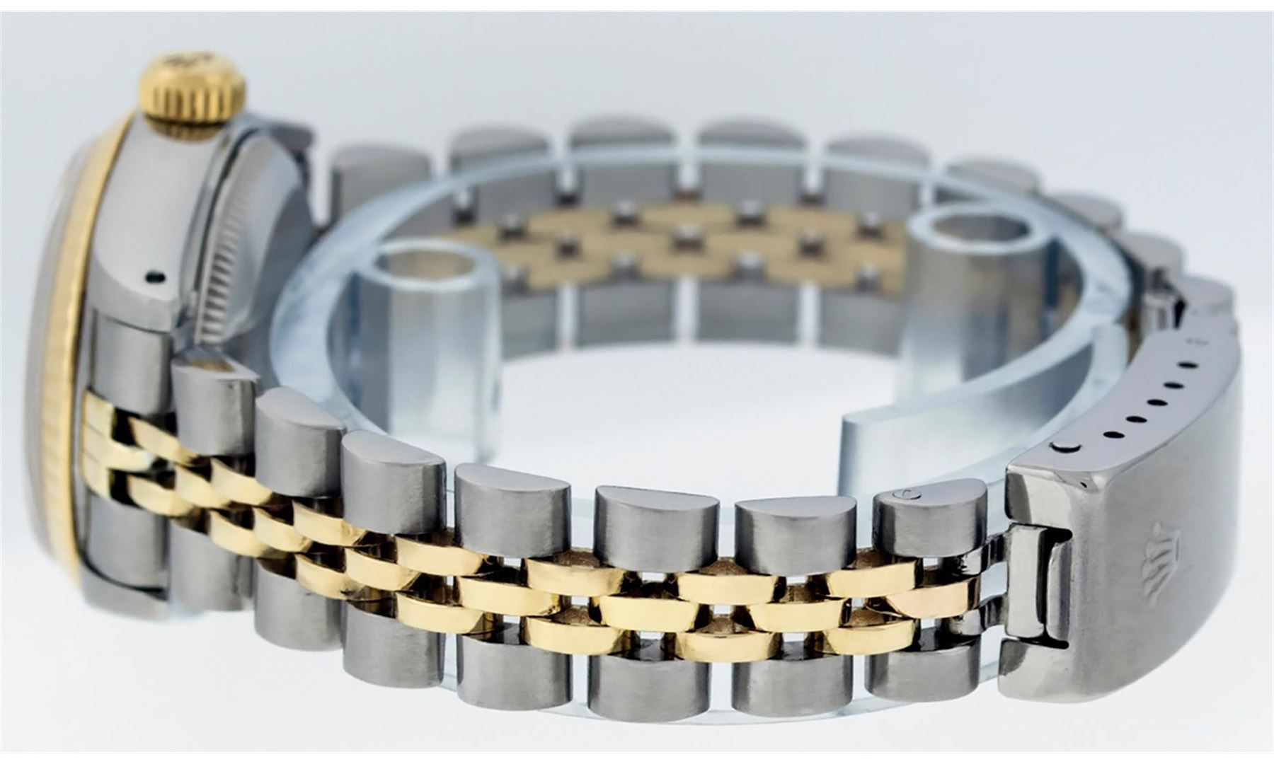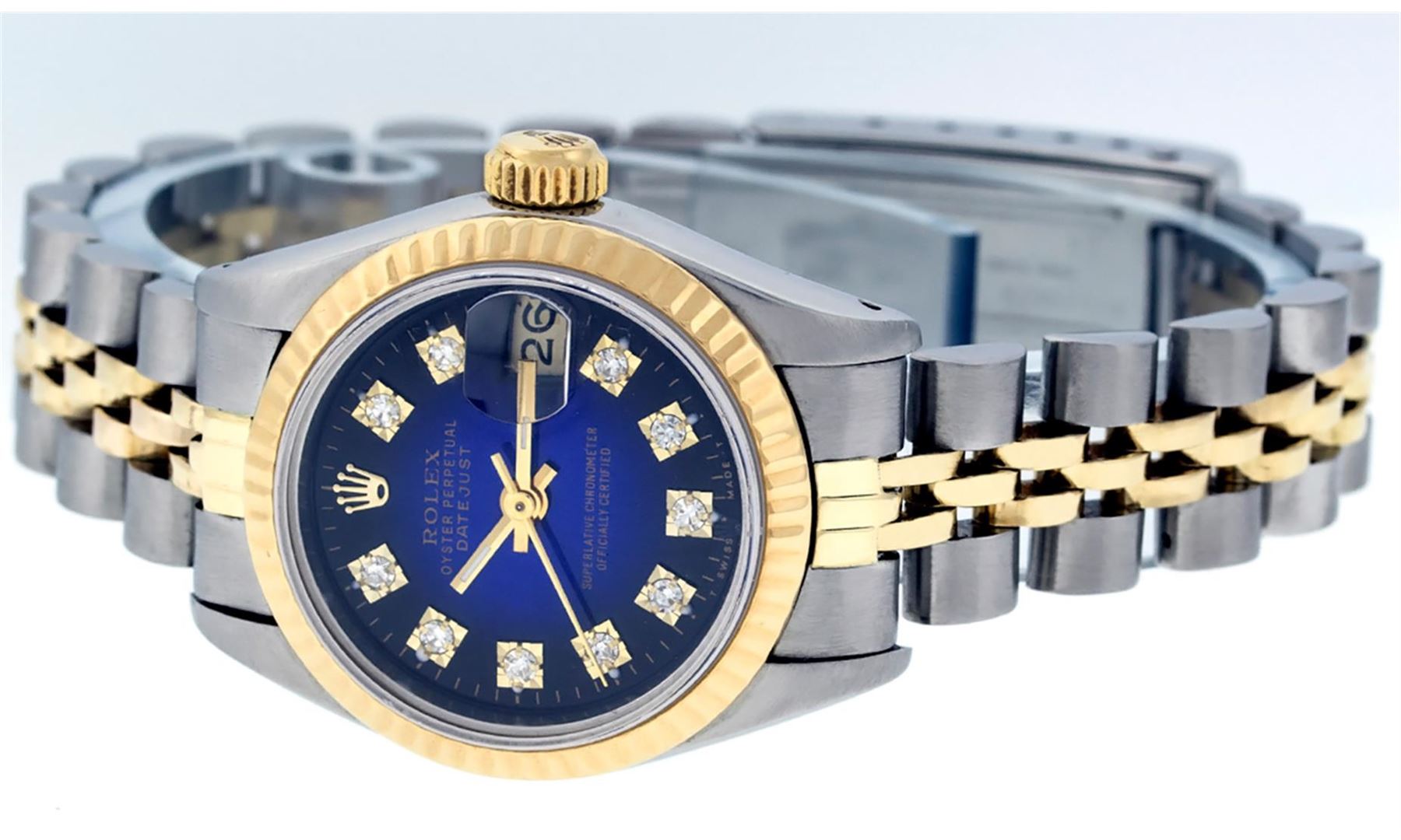One Ladies Two Tone Rolex Datejust Polished, Serviced & Electronically Tested, 14K Yellow Gold & Stainless Steel Case:26mm, 14K Yellow Gold Crown, Bezel: 14K Yellow Gold Fluted Bezel. Custom Crystal: Acrylic Cyclops Lens. Movement: Automatic Winding Movement Caliber 2030. Custom Dial: Blue Vignette With VS Diamond Hour Markers, Diamond Count: 10 Diamonds In Dial, Color: G to H, Clarity: VS. Date Window: 3 O'Clock Position Date Display, Model: Datejust, Condition: G-6 Extra Fine. Bracelet: Two Tone 14K Yellow Gold & Stainless Steel Jubilee. Bright Polish. 5.5 Inch Length, Adjustable. Standard Clasp, With Rolex Logo. Watch Has Been Serviced And Polished It Is Free Of All Scratches And Dents.