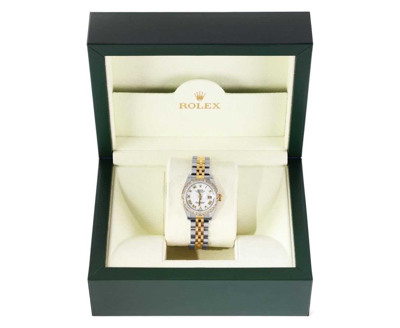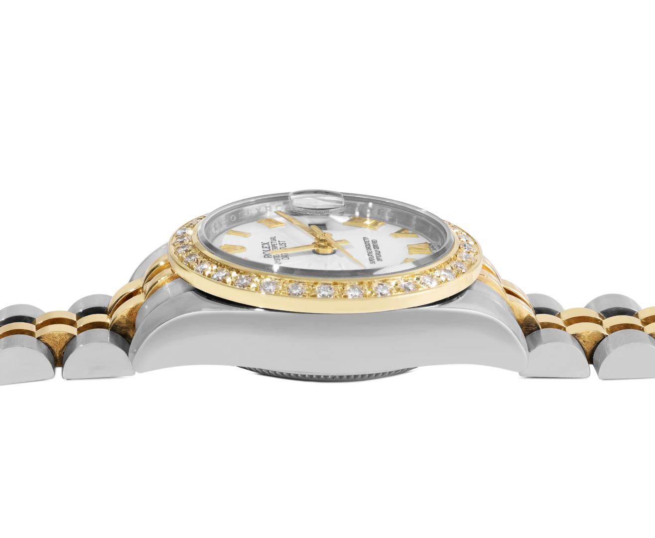 One Rolex Ladies Pre Owned Two Tone 18K Yellow Gold And Stainless Steel Rolex Datejust Polished, Serviced And Electronically Tested, Rolex Yellow Gold And Stainless Steel Case: 26mm, Rolex Yellow Gold Crown. Custom Bezel: New 18K Yellow Gold Beadset Diamond Bezel, Diamond Count: 32 Diamonds On Bezel. Crystal: Sapphire Crystal With Date Window. Hands: Solid Hands. Rolex Movement: 2235 Automatic Winding Movement. Rolex Dial: Factory White Roman Dial. Date Window: 3 O'Clock Position Date Display, Condition: G-6 Extra Fine. Rolex Bracelet: Two Tone 18K Yellow Gold And Stainless Steel Jubilee Band. Bright Polish & Satin Finish. 6.0 Inch Length, Adjustable. Hidden Clasp, With Rolex Logo. This Watch Has Been Serviced Time Tested And Is In Excellent Condition It Is Free Of All Scratches And Dents. This Watch Comes With A Rolex Box.