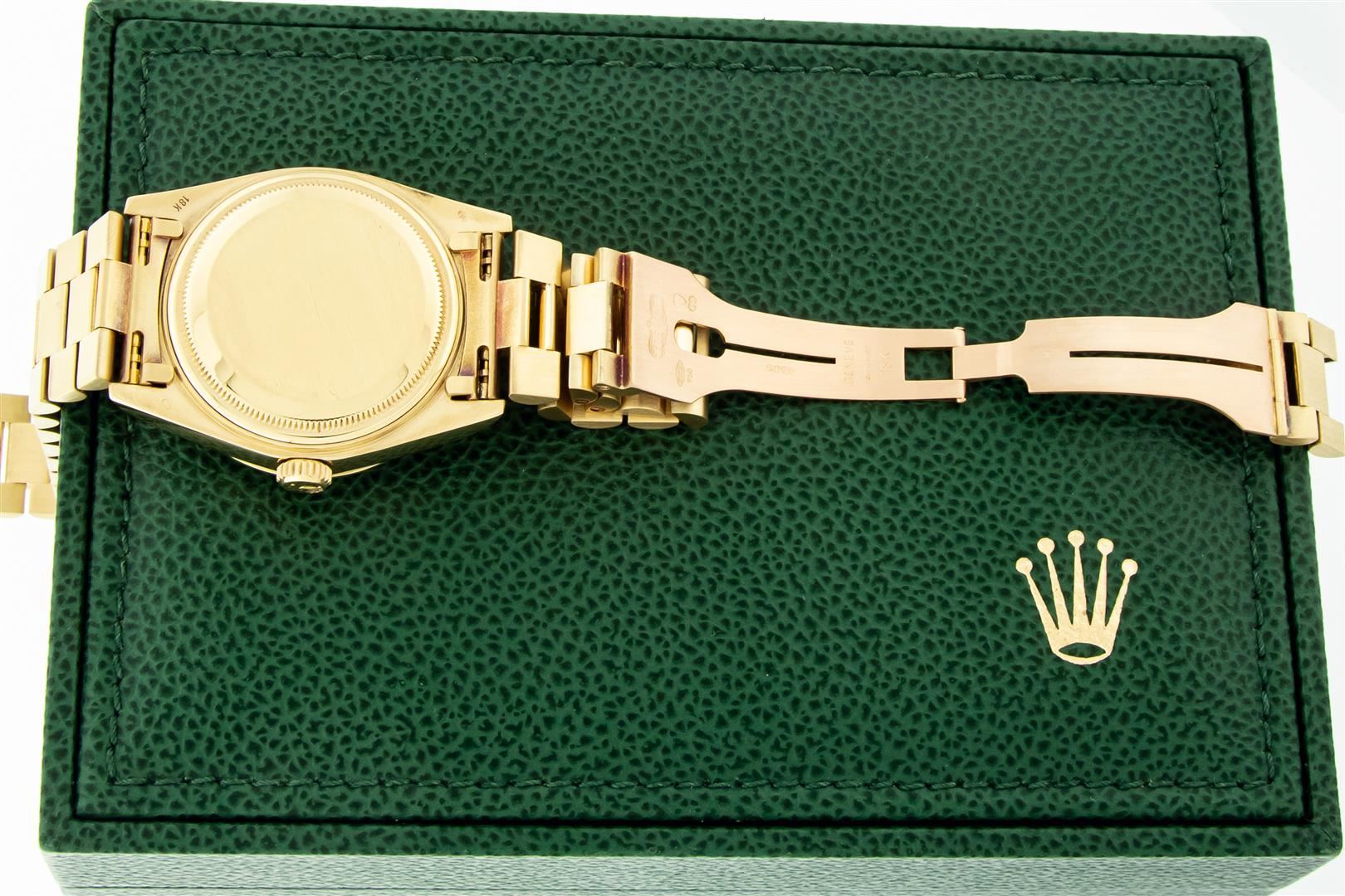 One Men's Rolex Day Date 18K Yellow Gold President Polished, Serviced & Electronically Tested, 18K Yellow Gold Case: 36mm, 18K Yellow Gold Crown, Custom Bezel: New 18K Yellow Gold 2.5ctw Beadset Diamond Bezel, Diamond Count: 42 Diamonds On Bezel. Total Bezel Weight 2.5 Carat, Clarity: SI-VS, Color: G to H. Custom Crystal: New Sapphire With Magnified Date Window. Rolex Movement: Automatic Winding Movement Caliber 3055. Custom Dial: Refinished To Black With Custom Added Diamond Hour Markers, Diamond Count: 8 Diamonds + 2 Diamond Baguettes, Color: G to H, Clarity: SI-VS. Date Window: 3 O'clock Position Date Display, Day Window: 12 O'clock Position Date Display. Quickset, Model: Day Date Quickset President. Condition: G-6 Extra Fine The Watch Is In Very Good Pre Owned Condition Free Of All Scratches And Dents. Bracelet: 18K Yellow Gold President Band. Bright Polish. 7.0 Inch Length, Standard Hidden President Clasp President Band, With Rolex Logo. This Watch Comes With A Rolex Box.