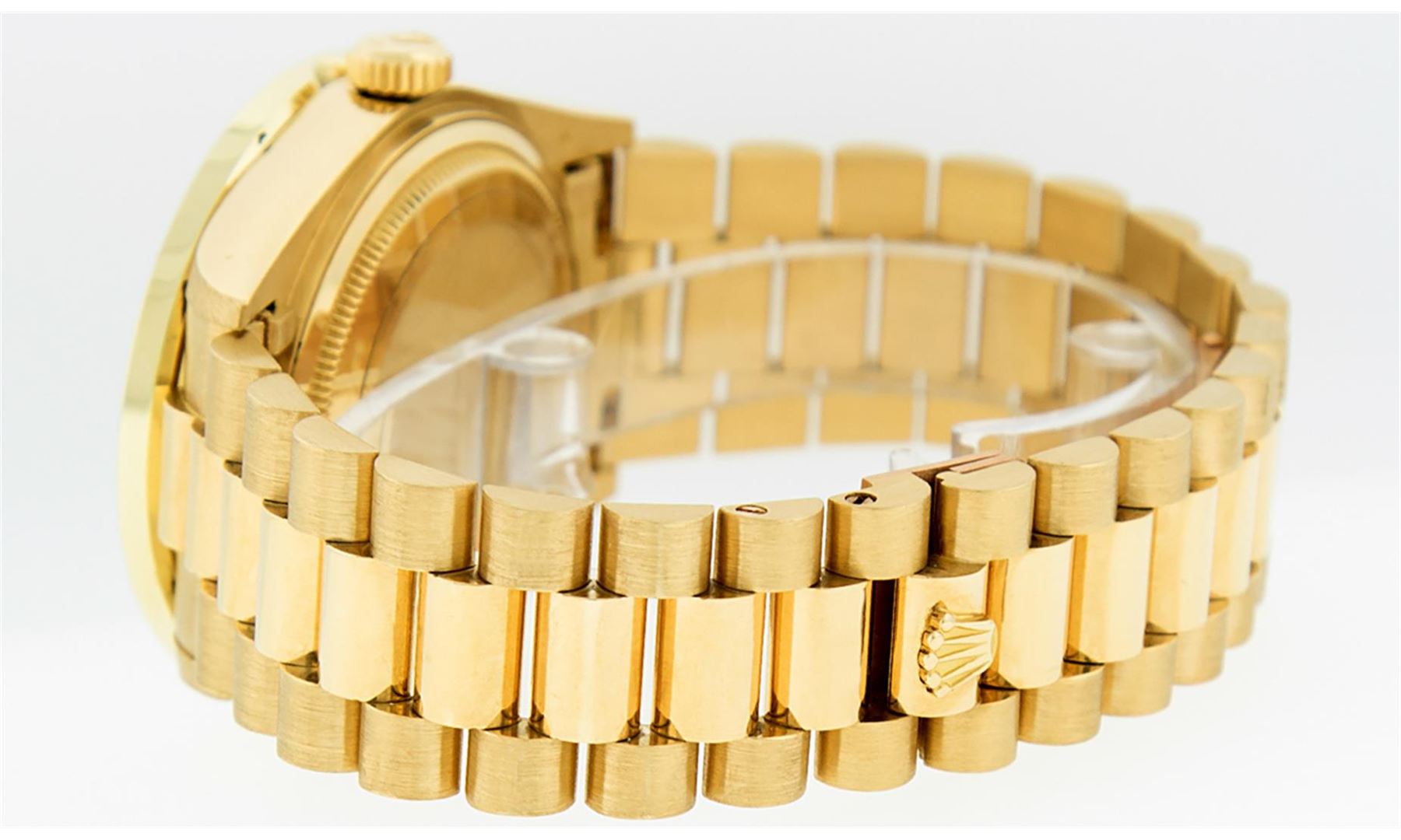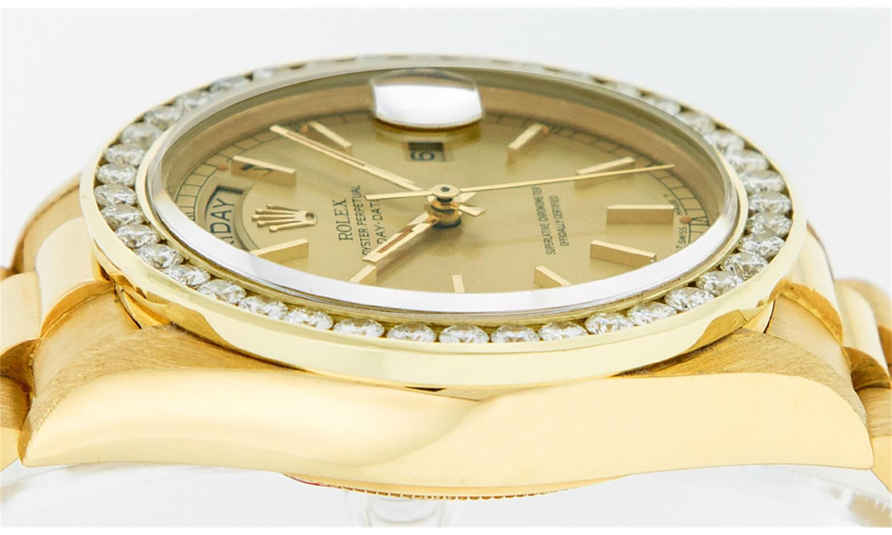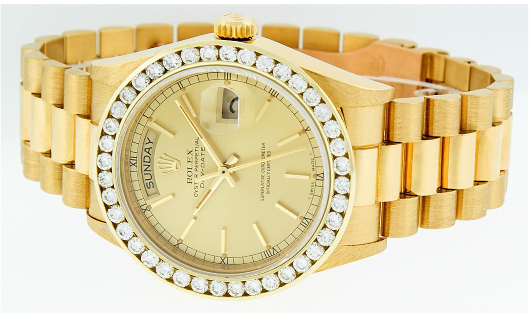 One Men's Pre Owned Rolex Day Date 18K Yellow Gold President Polished, Serviced & Electronically Tested, Rolex 18K Yellow Gold Case: 36mm, Rolex 18K Yellow Gold Crown, Custom Bezel: New 18K Yellow Gold Channel Set With Genuine Diamonds, Diamond Count: 40 Diamonds On Bezel Bezel. Total Bezel Weight 3.0 Carat, Clarity: SI-VS, Color: G to H. Custom Crystal: New Scratch Resistant Synthetic Sapphire Cyclops Lens. Custom Hands: New Luminescent Hands. Rolex Movement: Automatic Winding Movement Caliber 3055. Rolex Dial: Champagne Index With Square Roman Track. Date Window: 3 O'Clock Position Date Display, Day Window: 12 O'Clock Position Date Display. Quickset, Model: Day Date President. Condition: G-6 Extra Fine The Watch Is In Very Good Condition Free Of All Scratches And Dents. Rolex Bracelet: 18K Yellow Gold President. Bright Polish. 7.0 Inch Length, Standard Hidden President Clasp President Band, With Rolex Logo. This Watch Comes With A Rolex Box.