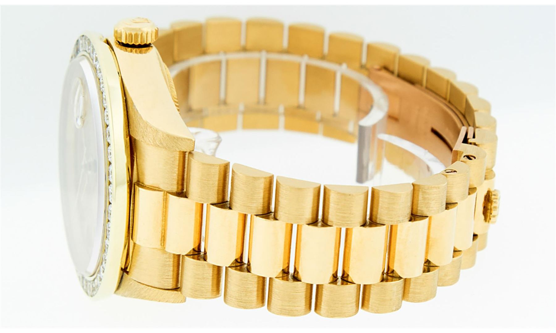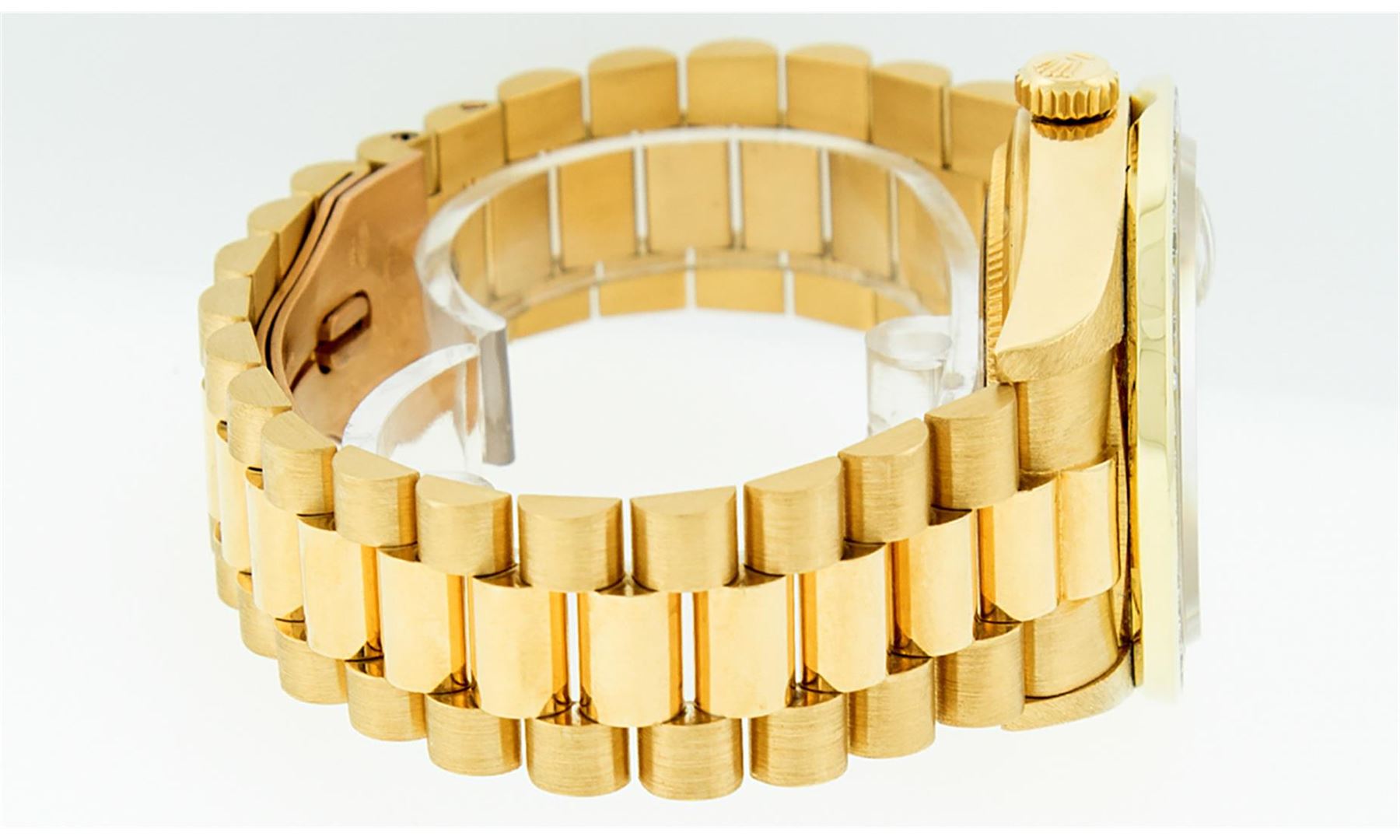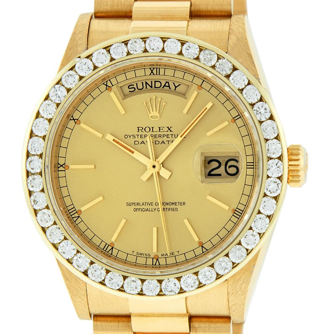 One Men's Pre Owned Rolex Day Date 18K Yellow Gold President Polished, Serviced & Electronically Tested, Rolex 18K Yellow Gold Case: 36mm, Rolex 18K Yellow Gold Crown, Custom Bezel: New 18K Yellow Gold Channel Set With Genuine Diamonds, Diamond Count: 40 Diamonds On Bezel Bezel. Total Bezel Weight 3.0 Carat, Clarity: SI-VS, Color: G to H. Custom Crystal: New Scratch Resistant Synthetic Sapphire Cyclops Lens. Custom Hands: New Luminescent Hands. Rolex Movement: Automatic Winding Movement Caliber 3055. Rolex Dial: Champagne Index With Square Roman Track. Date Window: 3 O'Clock Position Date Display, Day Window: 12 O'Clock Position Date Display. Quickset, Model: Day Date President. Condition: G-6 Extra Fine The Watch Is In Very Good Condition Free Of All Scratches And Dents. Rolex Bracelet: 18K Yellow Gold President. Bright Polish. 7.0 Inch Length, Standard Hidden President Clasp President Band, With Rolex Logo. This Watch Comes With A Rolex Box.