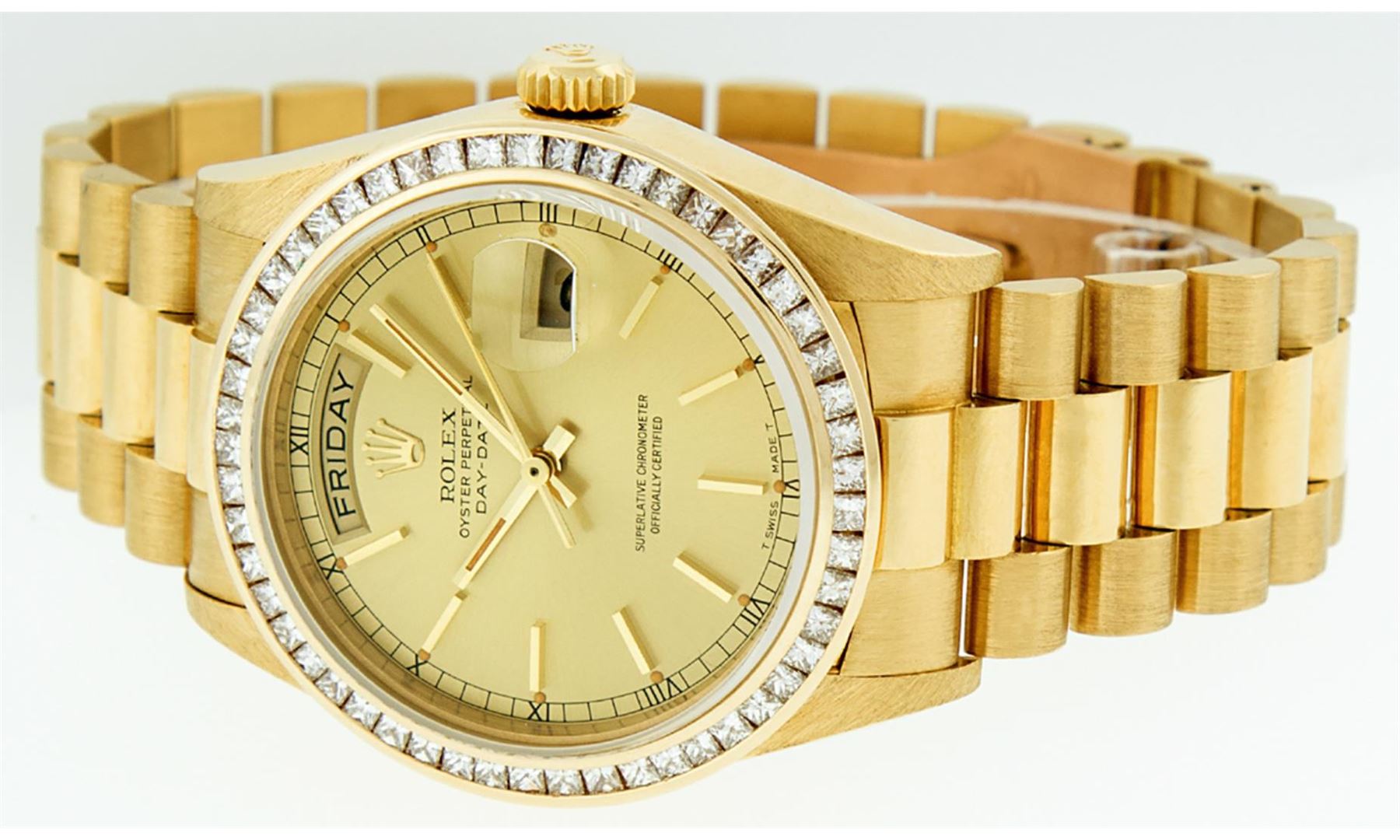 One Men's Rolex Day Date 18K Yellow Gold President Polished, Serviced & Electronically Tested, Rolex 18K Yellow Gold Case: 36mm, Rolex 18K Yellow Gold Crown, Custom Bezel: New 14K Yellow Gold Princess Cut Diamond Bezel, Diamond Count: 53 Diamonds On Bezel. Total Weight 2.75 Carat, Clarity: SI-VS, Color: G to H. Custom Crystal: New Sapphire With Magnified Date Window. Hands: Luminescent Hands. Rolex Movement: Automatic Winding Movement Caliber 3055. Rolex Dial: Champagne Index Dial With Square Roman Track And Lumi Dots. Date Window: 3 O'Clock Position Date Display, Day Window: 12 O'Clock Position Date Display. Quickset, Model: Day Date Quickset President. Condition: G-6 Extra. Rolex Bracelet: 18K Yellow Gold President Band. Bright Polish. 7.0 Inch Length, Standard Hidden President Clasp President Band, With Rolex Logo. This Pre Owned Watch Has Been Serviced Time Tested And Is In Excellent Condition It Is Free Of All Scratches And Dents.