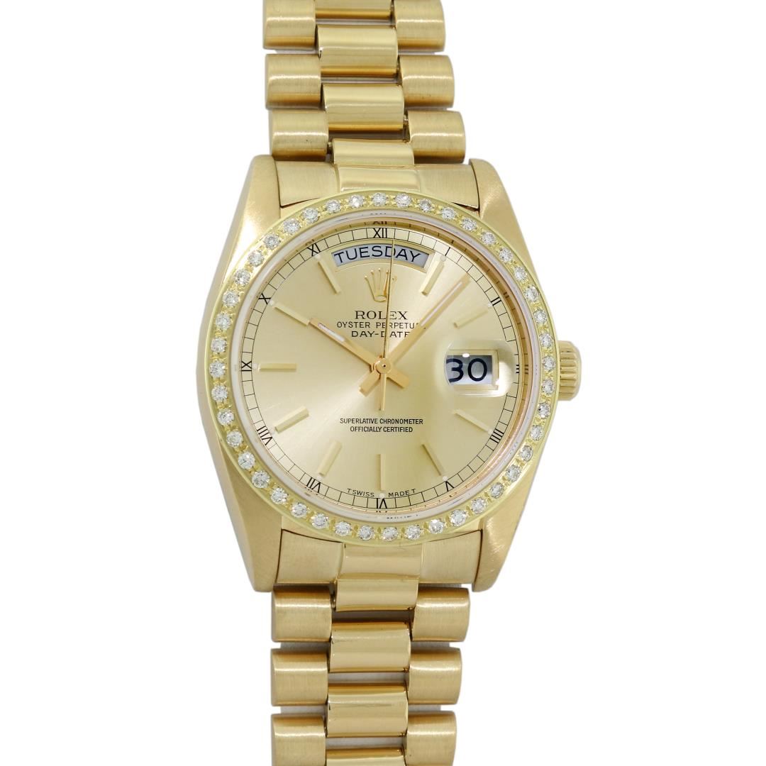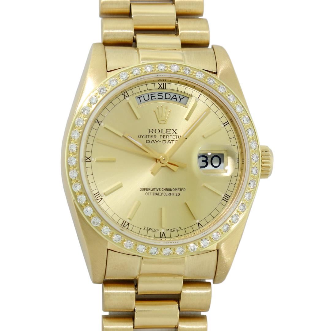 One Men's Rolex Day Date 18K Yellow Gold President Polished, Serviced & Electronically Tested, Rolex 18K Yellow Gold Case: 36mm, Rolex 18K Yellow Gold Crown, Custom Bezel: New 18K Yellow Gold Beadset Diamond Bezel, Diamond Count: 44 Diamonds On Bezel. Total Bezel Weight 1.0 Carat, Clarity: SI-VS, Color: G to H. Custom Crystal: New Sapphire With Magnified Date Window. Custom Hands: New Luminescent Hands. Rolex Movement: Automatic Winding Movement Caliber 3055. Rolex Dial: Champagne Index With Square Roman Track And Lumi Dot. Date Window: 3 O'Clock Position Date Display, Day Window: 12 O'Clock Position Date Display. Quickset, Model: Day Date Quickset President. Condition: G-6 Extra Fine. Rolex Bracelet: 18K Yellow Gold President Band. Bright Polish. 7.0 Inch Length, Hidden President Clasp, With Rolex Logo. This Pre Owned Watch Has Been Serviced Time Tested And Is In Excellent Condition It Is Free Of All Scratches And Dents.