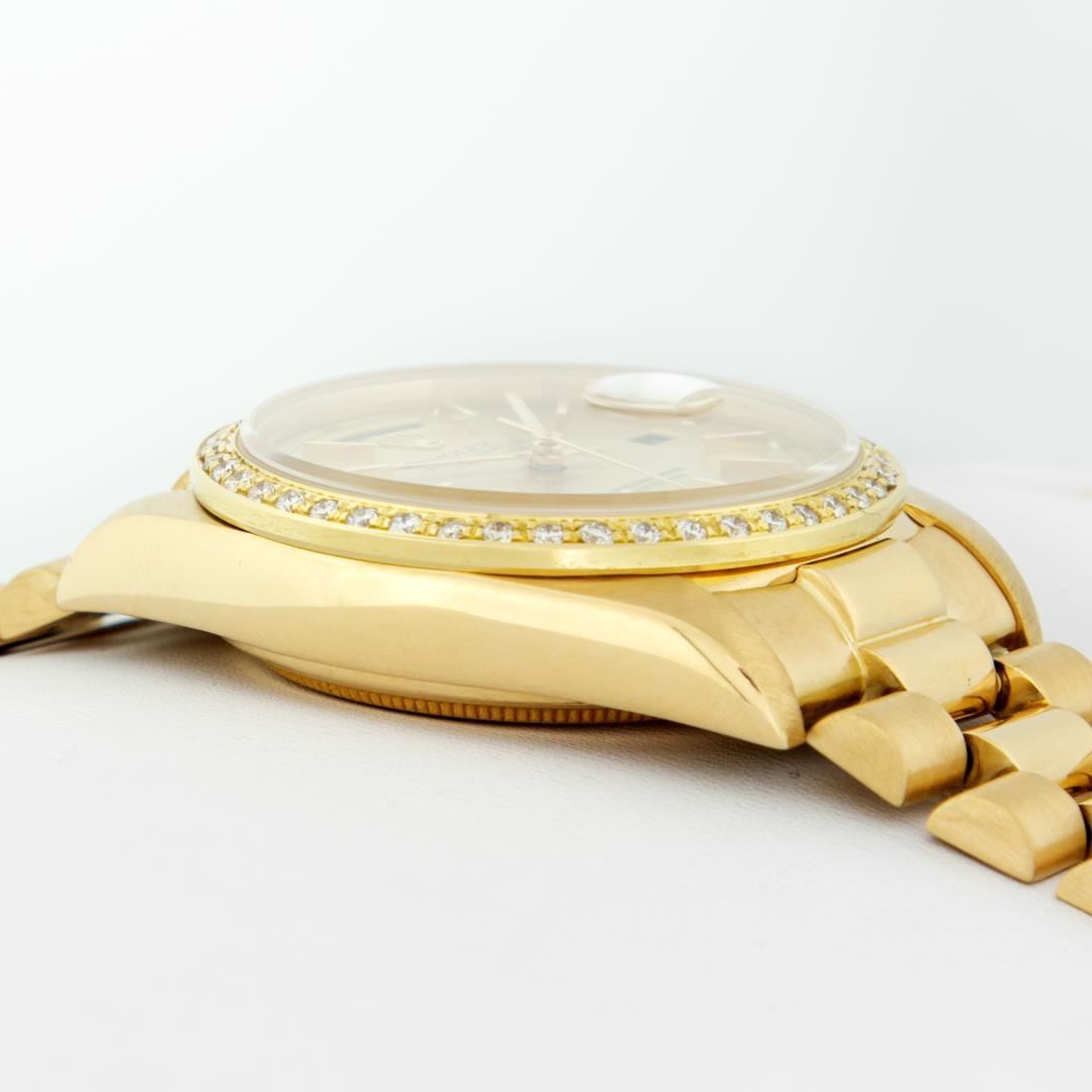 One Men's Rolex Day Date 18K Yellow Gold President Polished, Serviced & Electronically Tested, Rolex 18K Yellow Gold Case: 36mm, Rolex 18K Yellow Gold Crown, Custom Bezel: New 18K Yellow Gold Beadset Diamond Bezel, Diamond Count: 44 Diamonds On Bezel. Total Bezel Weight 1.0 Carat, Clarity: SI-VS, Color: G to H. Custom Crystal: New Sapphire With Magnified Date Window. Custom Hands: New Luminescent Hands. Rolex Movement: Automatic Winding Movement Caliber 3055. Rolex Dial: Champagne Index With Square Roman Track And Lumi Dot. Date Window: 3 O'Clock Position Date Display, Day Window: 12 O'Clock Position Date Display. Quickset, Model: Day Date Quickset President. Condition: G-6 Extra Fine. Rolex Bracelet: 18K Yellow Gold President Band. Bright Polish. 7.0 Inch Length, Hidden President Clasp, With Rolex Logo. This Pre Owned Watch Has Been Serviced Time Tested And Is In Excellent Condition It Is Free Of All Scratches And Dents.