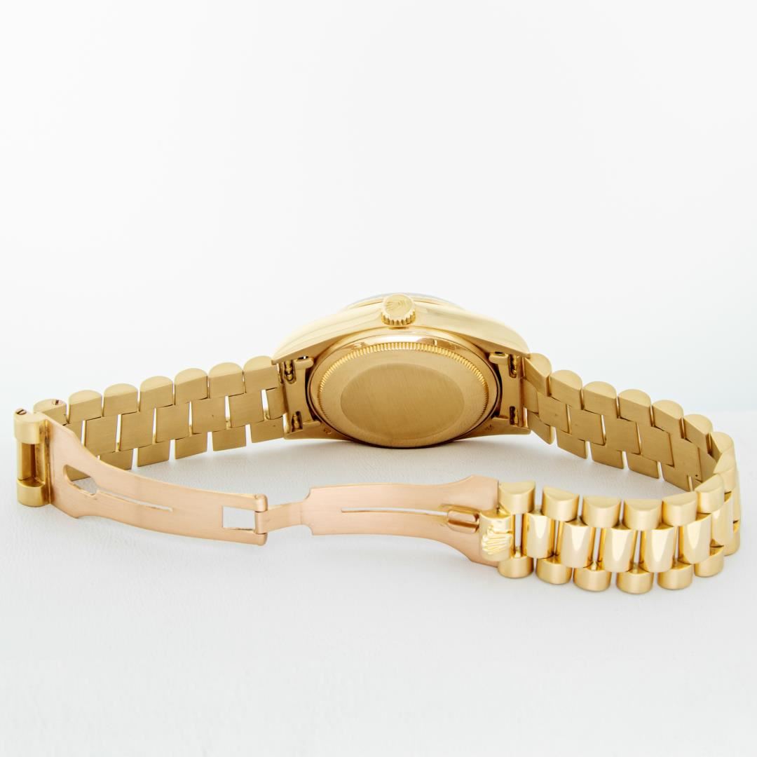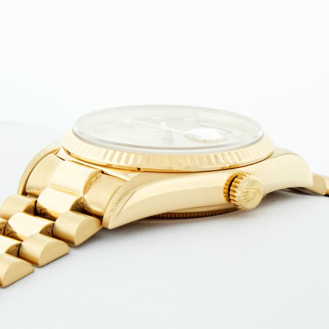 One Men's Quickset Rolex Day Date 18K Yellow Gold President Polished, Serviced & Electronically Tested, Rolex 18K Yellow Gold Case: 36mm, Rolex 18K Yellow Gold Crown, Rolex Bezel: 18K Yellow Gold Fluted Bezel. Crystal: Sapphire With Magnified Date Window. Rolex Movement: Automatic Quickset Winding Movement Caliber 3055. Rolex Dial: Factory Champagne Diamond Dial With Dash Track And Lumi Dots, Stone Count: 8 Diamonds + 2 Baguette Diamonds, Clarity: VS. Date Window: 3 O'Clock Position, Day Display: 12 O'Clock Position, Single Quickset, Model: Day Date Quickset President. Condition: G-6 Extra Fine. Rolex Bracelet: 18K Yellow Gold President Band With Hidden Clasp, Bright & Satin Polish. 7.0 Inch Length, Standard Hidden President Clasp, With Rolex Logo. This Pre Owned Watch Has Been Serviced Time Tested And Is In Excellent Condition It Is Free Of All Scratches And Dents.