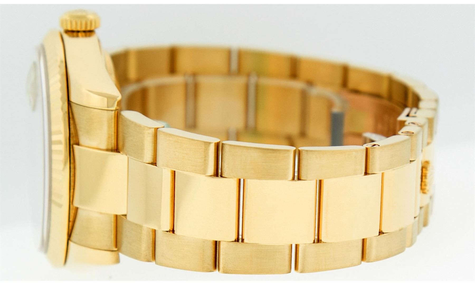 One Men's Rolex Day Date 18K Yellow Gold President Polished, Serviced & Electronically Tested, 18K Yellow Gold Case: 36mm, 18K Yellow Gold Crown, Rolex Bezel: 18K Yellow Gold Fluted Bezel. Rolex Crystal: Sapphire With Magnified Date Window. Rolex Hands: Non Luminescent Yellow Hands. Rolex Movement: Automatic Winding Movement Caliber 3155. Rolex Dial: Factory Champagne Diamond Dial With Square Roman Track, Diamond Count: 8 Diamonds + 2 Baguette Diamonds On Dial, Clarity:VVS. Date Window: 3 O'Clock Position Date Display, Day Window: 12 O'Clock Position Date Display. Double Quickset, Model: Day Date President. Condition: G-6 Extra Fine. Rolex Bracelet: 18K Yellow Gold Oyster President Band. Bright Polish. 7.0 Inch Length, Hidden Oyster President Clasp, With Rolex Logo. This Watch Comes With a Rolex Box And Watch Winder.