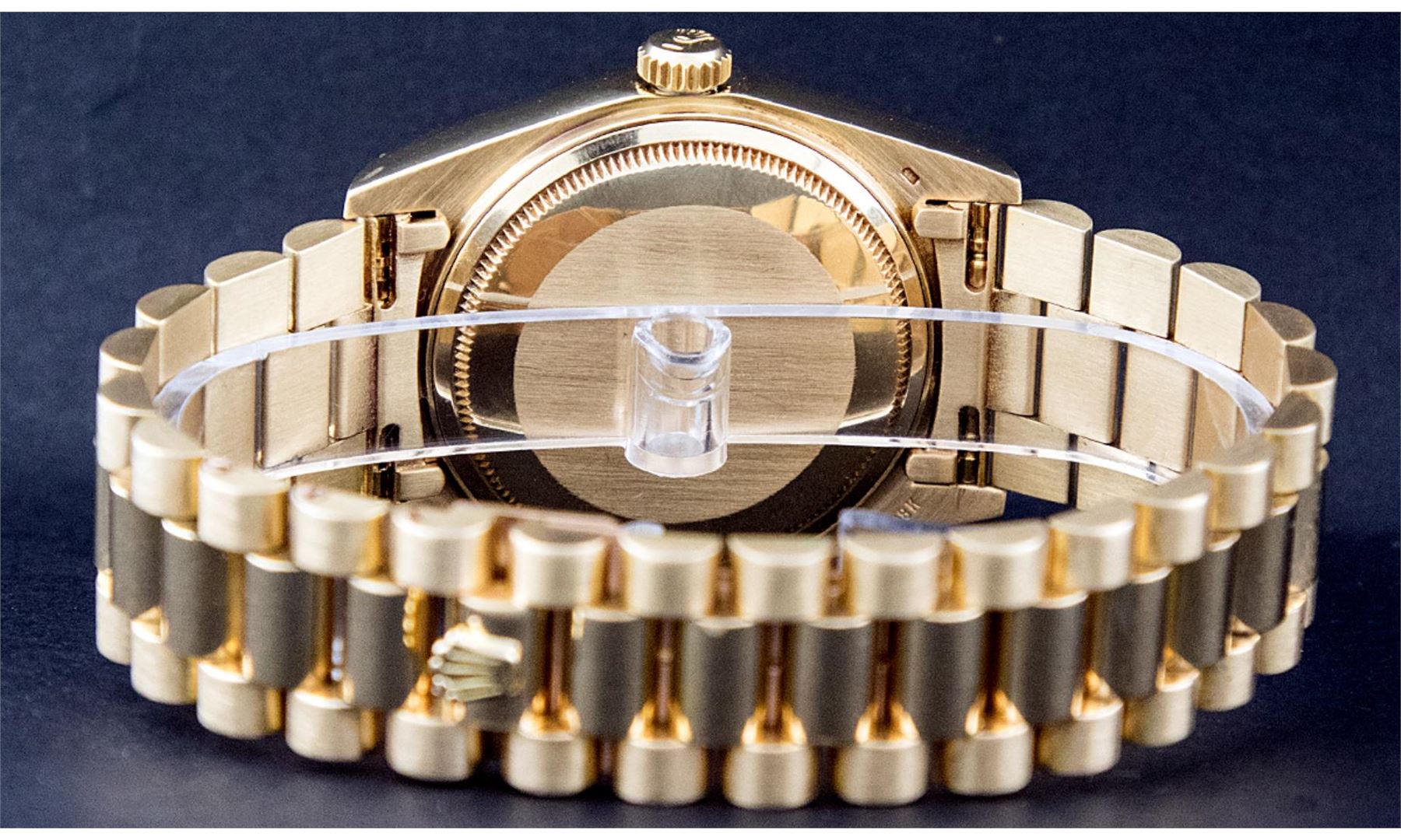 One Men's Double Quickset Rolex Day Date 18K Yellow Gold President Polished, Serviced & Electronically Tested, Rolex 18K Yellow Gold Case: 36mm, Rolex 18K Yellow Gold Crown, Rolex Bezel: 18K Yellow Gold Fluted Bezel. Crystal: Sapphire With Magnified Date Window. Hands: Luminescent Hands. Rolex Movement: Automatic Quickset Winding Movement Caliber 3155. Rolex Dial: Champagne Index With Roman Track & Lumi Dots. Date Window: 3 O'Clock Position, Day Display: 12 O'Clock Position, Double Quickset, Model: Day Date Double Quickset President. Condition: G-6 Extra Fine. Rolex Bracelet: 18K Yellow Gold President Band With Hidden Clasp, Bright & Satin Polish. 7.0 Inch Length, Hidden President Clasp, With Rolex Logo. This Pre Owned Watch Has Been Serviced Time Tested And Is In Excellent Condition It Is Free Of All Scratches And Dents.