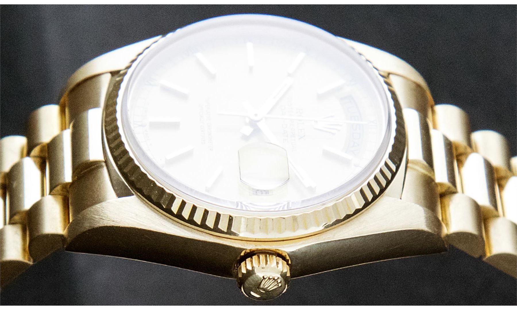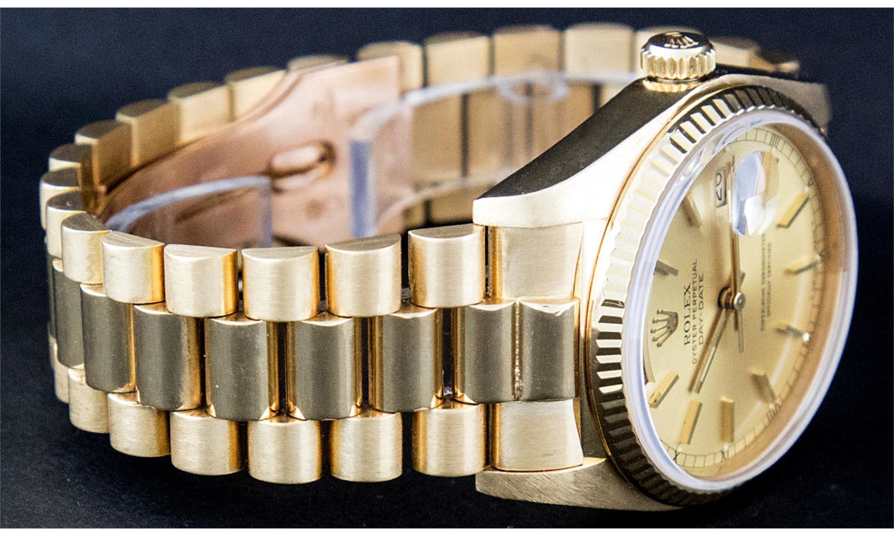 One Men's Double Quickset Rolex Day Date 18K Yellow Gold President Polished, Serviced & Electronically Tested, Rolex 18K Yellow Gold Case: 36mm, Rolex 18K Yellow Gold Crown, Rolex Bezel: 18K Yellow Gold Fluted Bezel. Crystal: Sapphire With Magnified Date Window. Hands: Luminescent Hands. Rolex Movement: Automatic Quickset Winding Movement Caliber 3155. Rolex Dial: Champagne Index With Roman Track & Lumi Dots. Date Window: 3 O'Clock Position, Day Display: 12 O'Clock Position, Double Quickset, Model: Day Date Double Quickset President. Condition: G-6 Extra Fine. Rolex Bracelet: 18K Yellow Gold President Band With Hidden Clasp, Bright & Satin Polish. 7.0 Inch Length, Hidden President Clasp, With Rolex Logo. This Pre Owned Watch Has Been Serviced Time Tested And Is In Excellent Condition It Is Free Of All Scratches And Dents.
