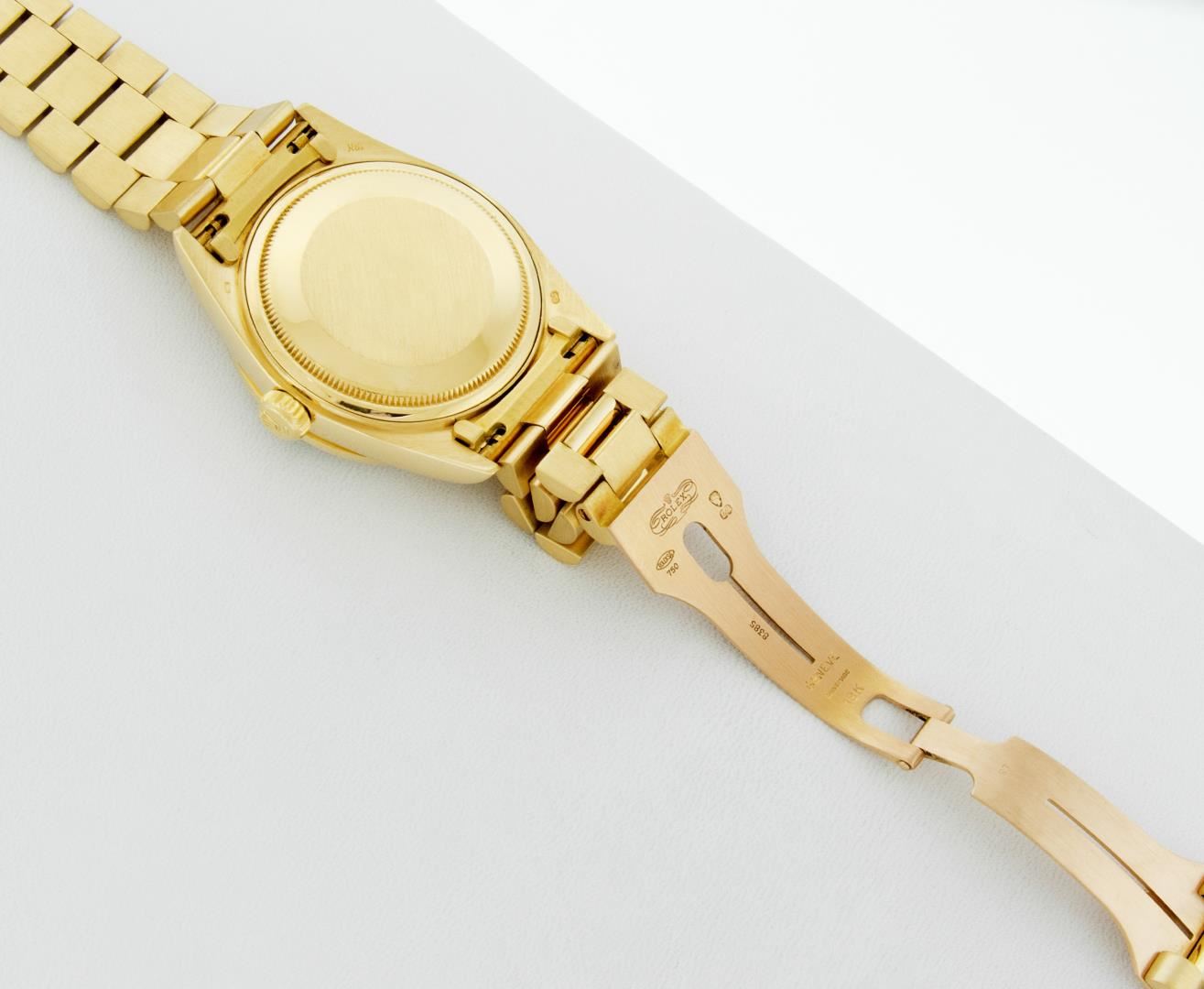 One Men's Quickset Rolex Day Date 18K Yellow Gold President Polished, Serviced & Electronically Tested, Rolex 18K Yellow Gold Case: 36mm, Rolex 18K Yellow Gold Crown, Custom Bezel: New 18K Yellow Diamond + Emerald Beadset Bezel, Stone Count: 36 Diamonds + 4 Emeralds, Total Weight .75 Carat, Clarity: SI-VS, Color: G to H. Custom Crystal: New Sapphire With Magnified Date Window. Custom Hands: New Luminescent Hands. Rolex Movement: Automatic Quickset Winding Movement Caliber 3055. Rolex Dial: Factory Champagne Diamond Dial With Dash Track And Lumi Dots, Stone Count: 8 Diamonds + 2 Baguettes, Clarity: VS. Date Window: 3 O'Clock Position, Day Display: 12 O'Clock Position, Single Quickset, Model: Day Date Quickset President. Condition: G-6 Extra Fine. Rolex Bracelet: 18K Yellow Gold President Band With Hidden Clasp, Bright & Satin Polish. 7.0 Inch Length, Hidden President Clasp, With Rolex Logo. This Pre Owned Watch Has Been Serviced Time Tested And Is In Excellent Condition It Is Free Of All Scratches And Dents.