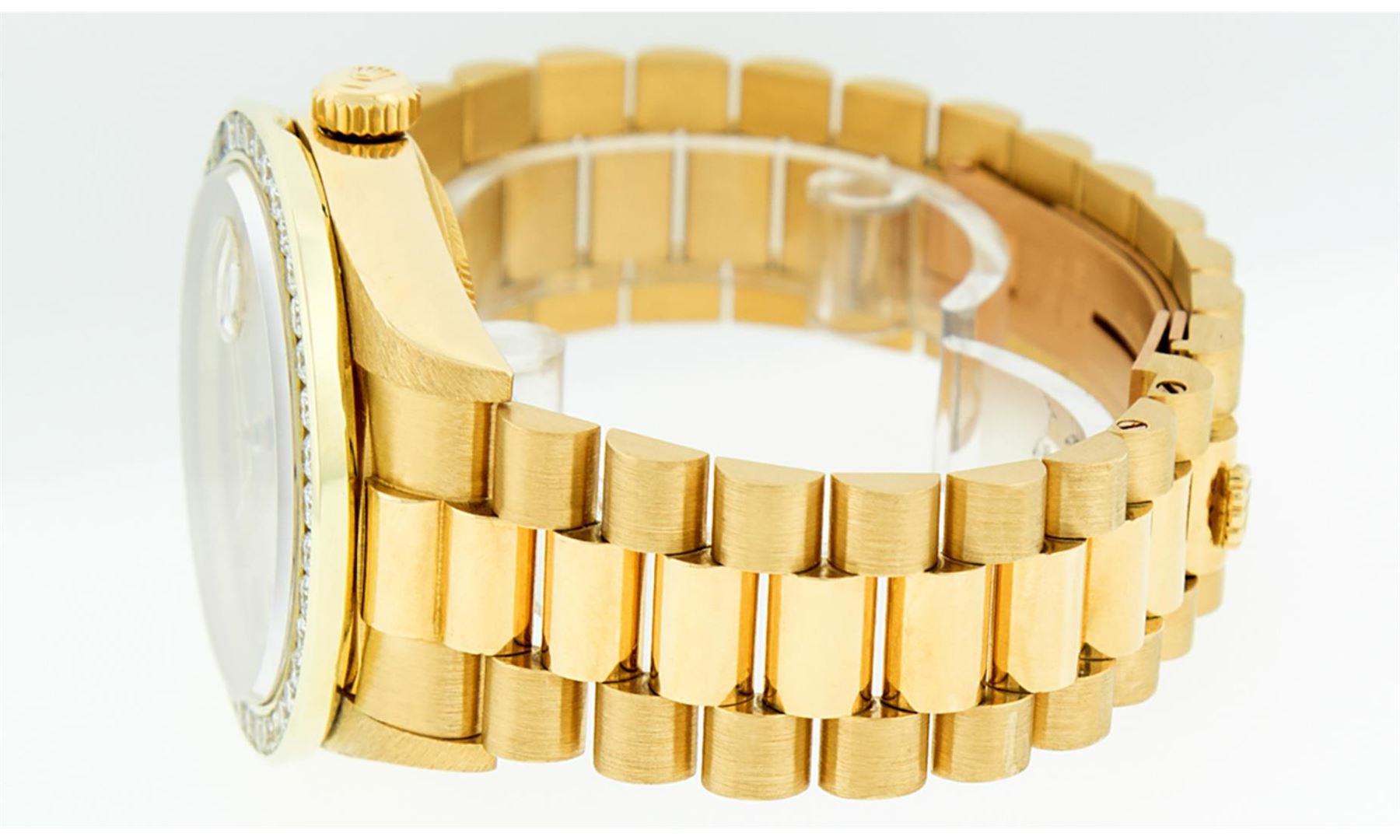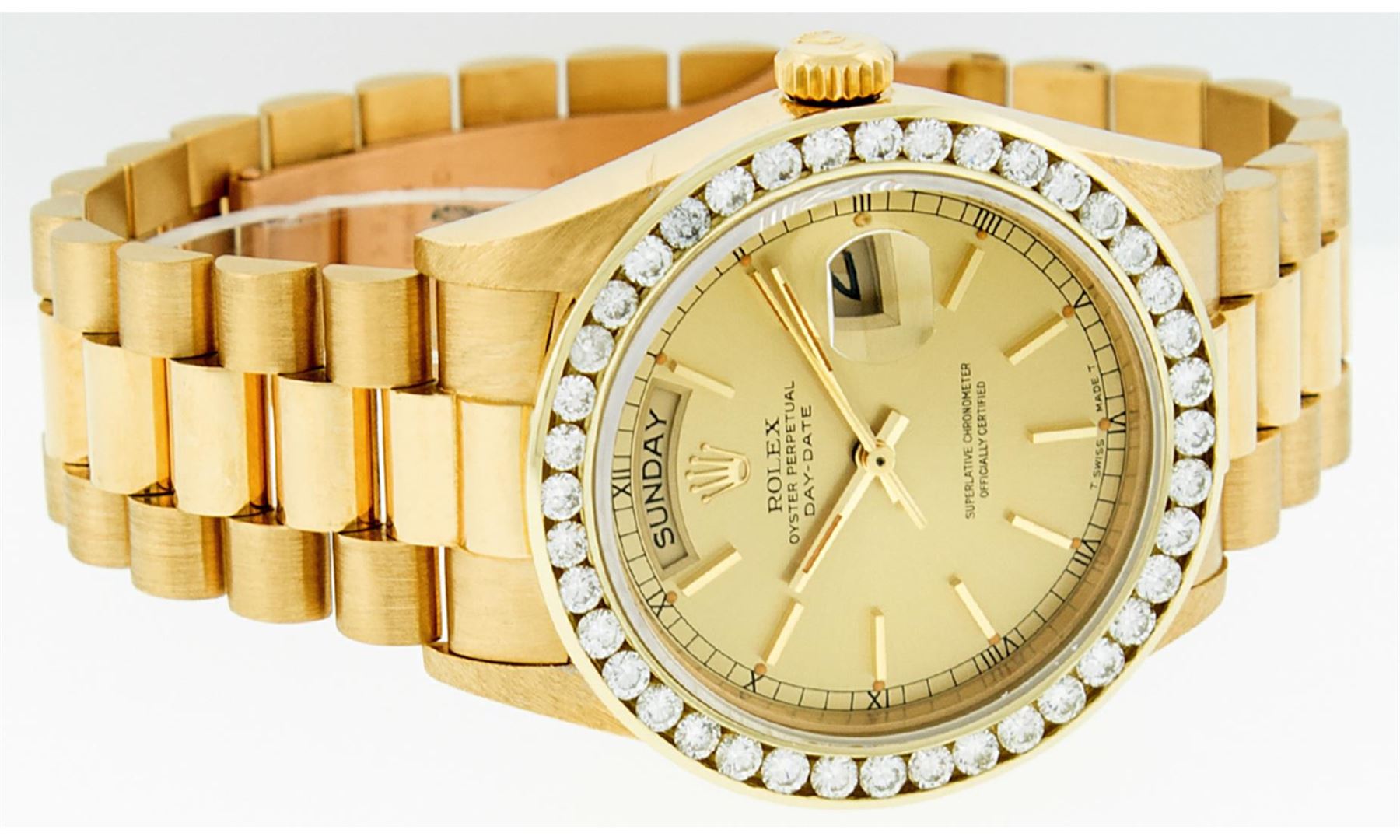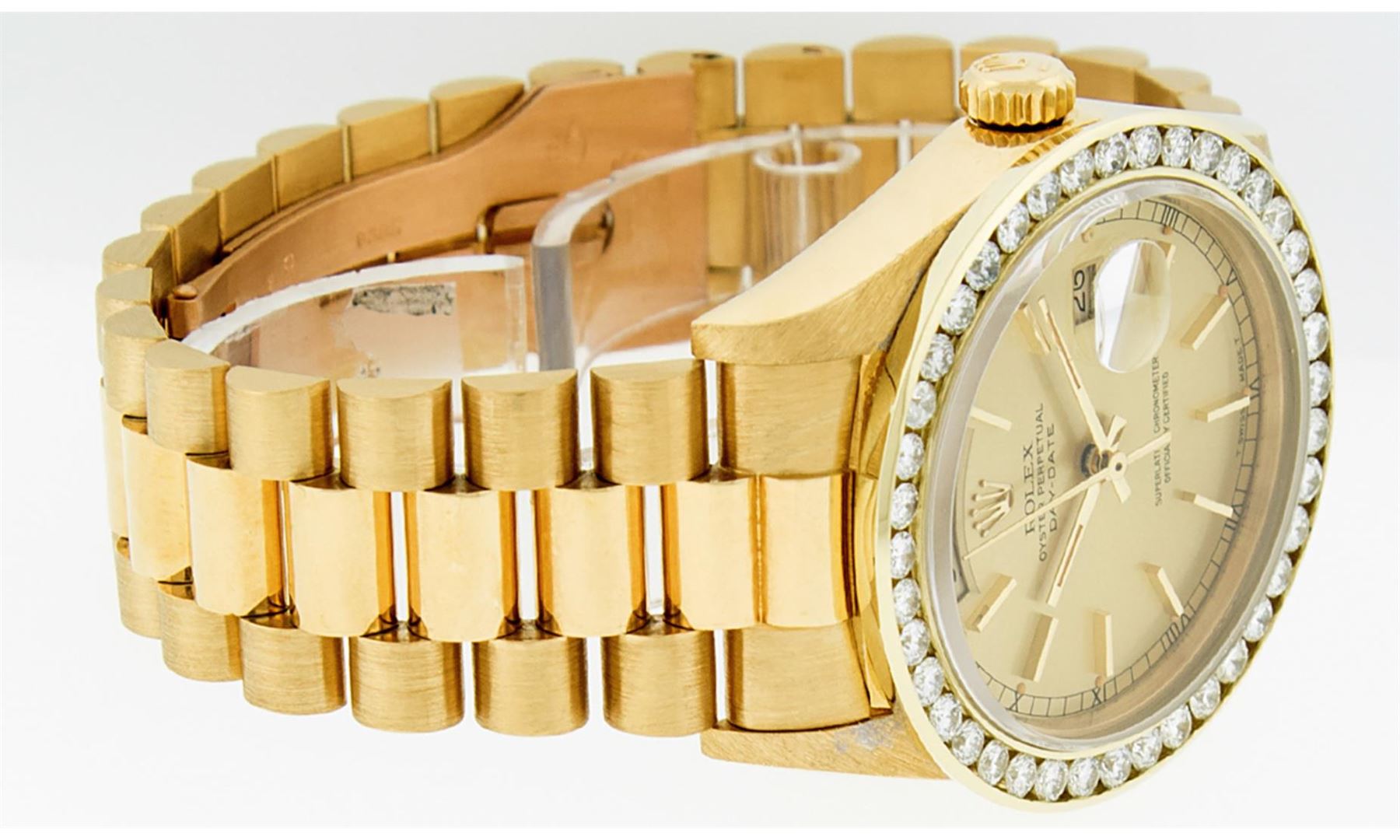 One Men's Rolex Day Date 18K Yellow Gold President Polished, Serviced & Electronically Tested, Rolex 18K Yellow Gold Case: 36mm, Rolex 18K Yellow Gold Crown, Custom Bezel: New 18K Yellow Gold Channel Bezel Set With Genuine Diamonds, Diamond Count: 40 Diamonds On Bezel . Total Bezel Weight 3.0 Carat, Clarity: SI-VS, Color: G to H. Custom Crystal: New Sapphire With Magnified Date Window. Hands: Luminescent Hands. Rolex Movement: Automatic Winding Movement Caliber 3055. Rolex Dial: Champagne Index With Square Roman Track And Lumi Dots. Date Window: 3 O'Clock Position Date Display, Day Window: 12 O'Clock Position Date Display. Quickset, Model: Day Date Quickset President. Condition: G-6 Extra. Rolex Bracelet: 18K Yellow Gold President. Bright Polish. 7.0 Inch Length, Standard Hidden President Clasp President Band, With Rolex Logo. This Pre Owned Watch Has Been Serviced Time Tested And Is In Excellent Condition It Is Free Of All Scratches And Dents.