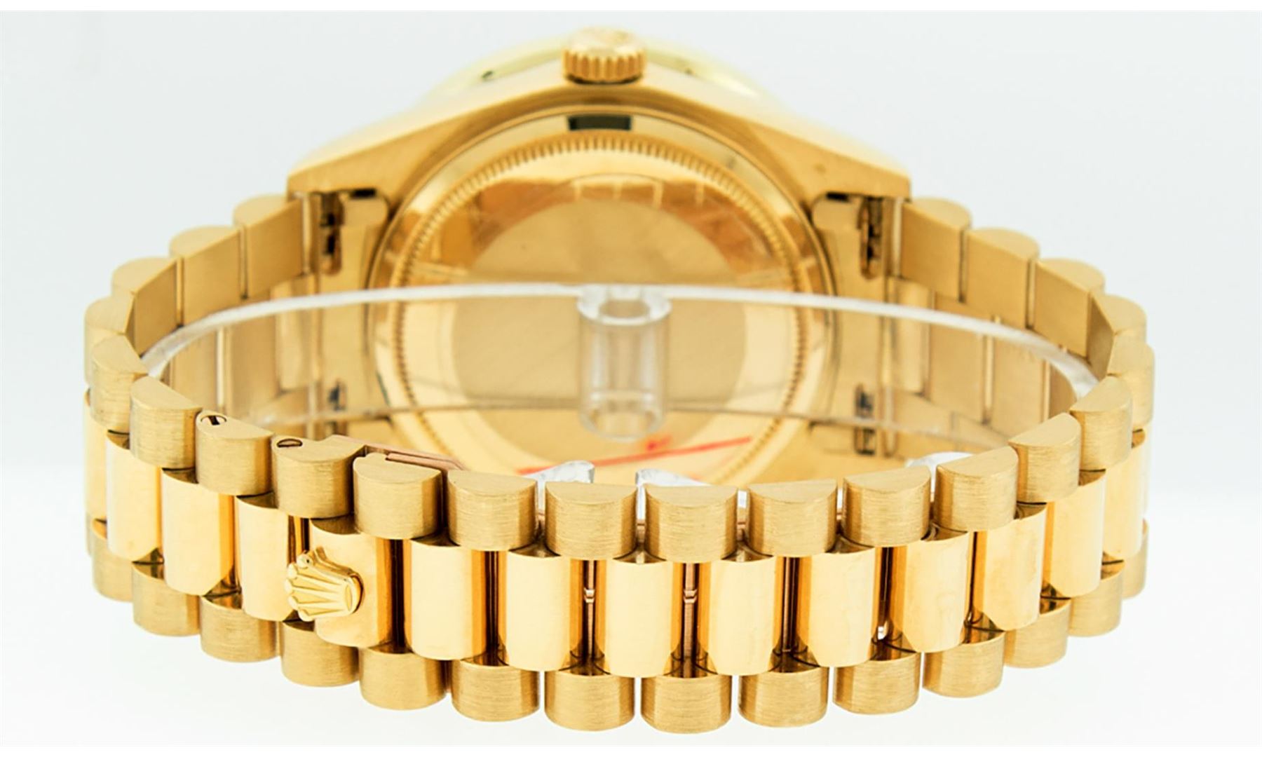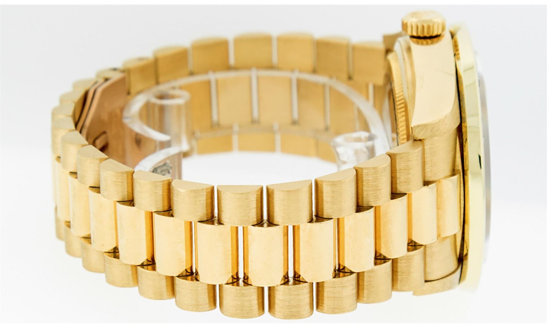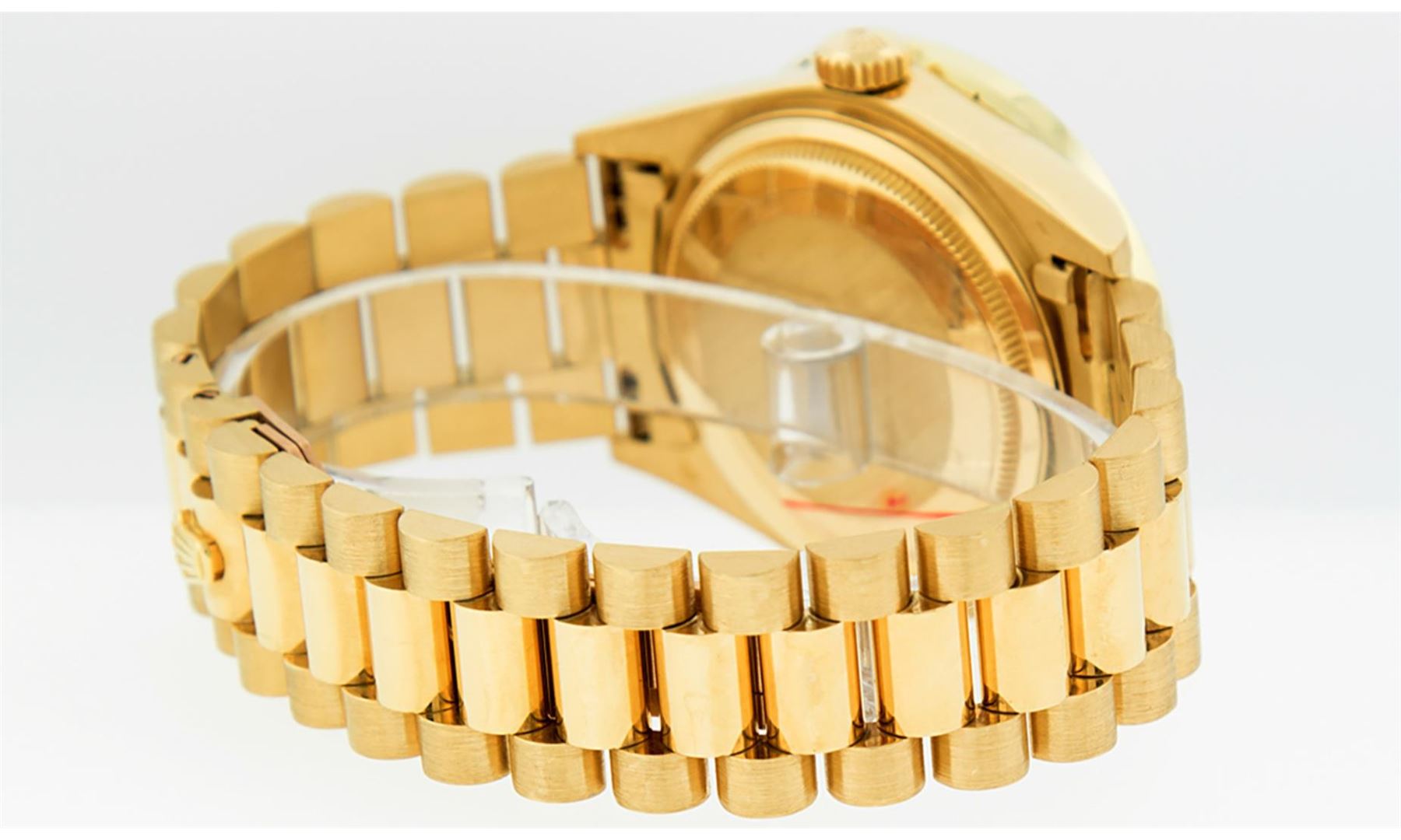 One Men's Rolex Day Date 18K Yellow Gold President Polished, Serviced & Electronically Tested, Rolex 18K Yellow Gold Case: 36mm, Rolex 18K Yellow Gold Crown, Custom Bezel: New 18K Yellow Gold Channel Bezel Set With Genuine Diamonds, Diamond Count: 40 Diamonds On Bezel . Total Bezel Weight 3.0 Carat, Clarity: SI-VS, Color: G to H. Custom Crystal: New Sapphire With Magnified Date Window. Hands: Luminescent Hands. Rolex Movement: Automatic Winding Movement Caliber 3055. Rolex Dial: Champagne Index With Square Roman Track And Lumi Dots. Date Window: 3 O'Clock Position Date Display, Day Window: 12 O'Clock Position Date Display. Quickset, Model: Day Date Quickset President. Condition: G-6 Extra. Rolex Bracelet: 18K Yellow Gold President. Bright Polish. 7.0 Inch Length, Standard Hidden President Clasp President Band, With Rolex Logo. This Pre Owned Watch Has Been Serviced Time Tested And Is In Excellent Condition It Is Free Of All Scratches And Dents.