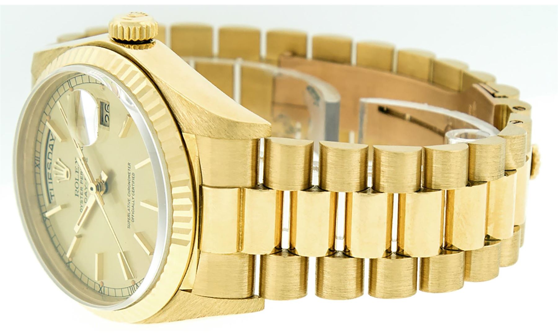 One Men's Quickset Rolex Day Date 18K Yellow Gold President Polished, Serviced & Electronically Tested, Rolex 18K Yellow Gold Case: 36mm, Rolex 18K Yellow Gold Crown, Rolex Bezel: 18K Yellow Gold Fluted Bezel. Crystal: Sapphire With Magnified Date Window. Hands: Luminescent Hands. Rolex Movement: Automatic Quickset Winding Movement Caliber 3055. Rolex Dial: Champagne Index With Roman Track & Lumi Dots. Date Window: 3 O'Clock Position, Day Display: 12 O'Clock Position, Single Quickset, Model: Day Date Quickset President. Condition: G-6 Extra Fine. Rolex Bracelet: 18K Yellow Gold President Band With Hidden Clasp, Bright & Satin Polish. 7.0 Inch Length, Standard Hidden President Clasp, With Rolex Logo. This Pre Owned Watch Has Been Serviced Time Tested And Is In Excellent Condition It Is Free Of All Scratches And Dents.
