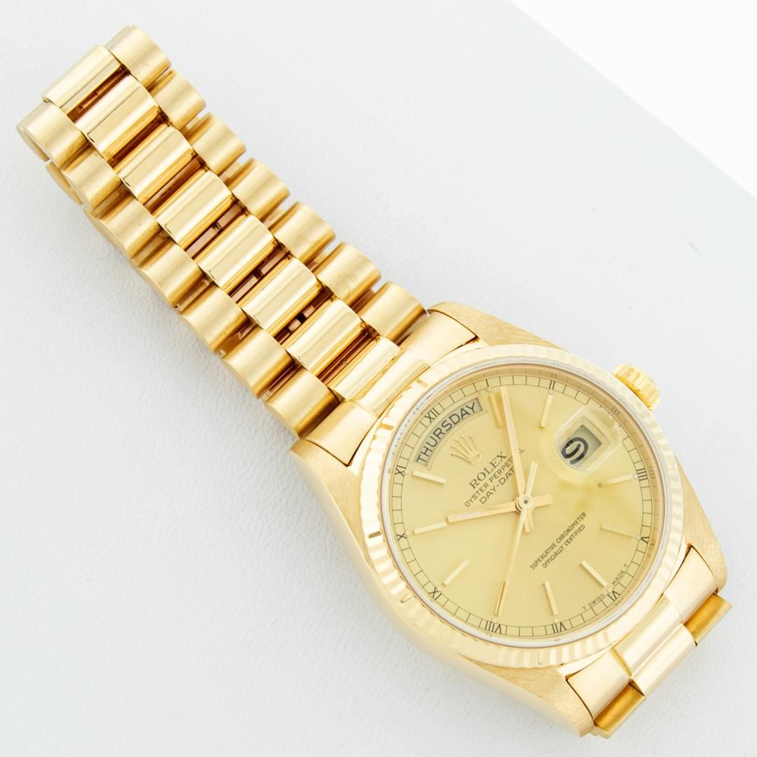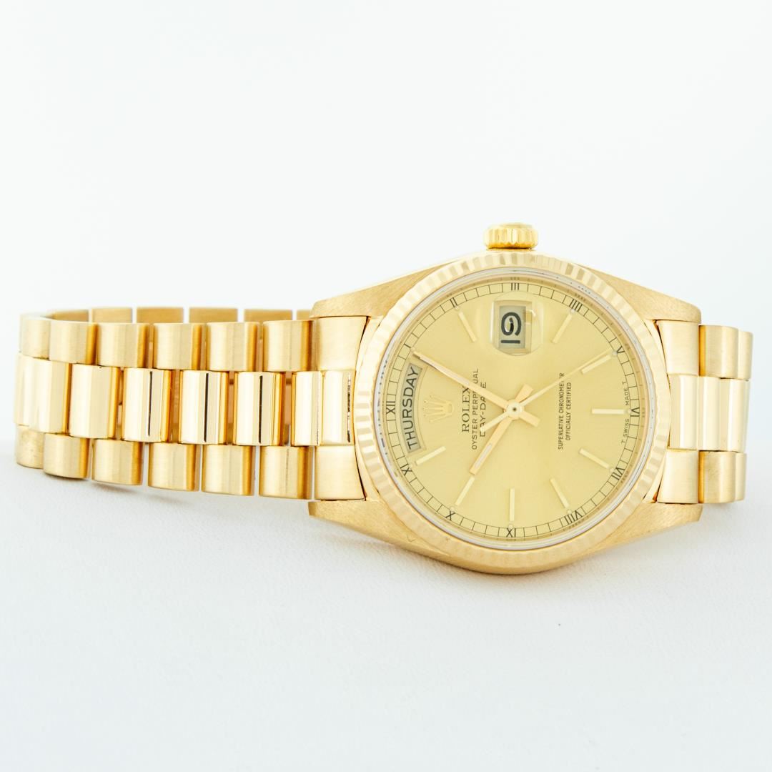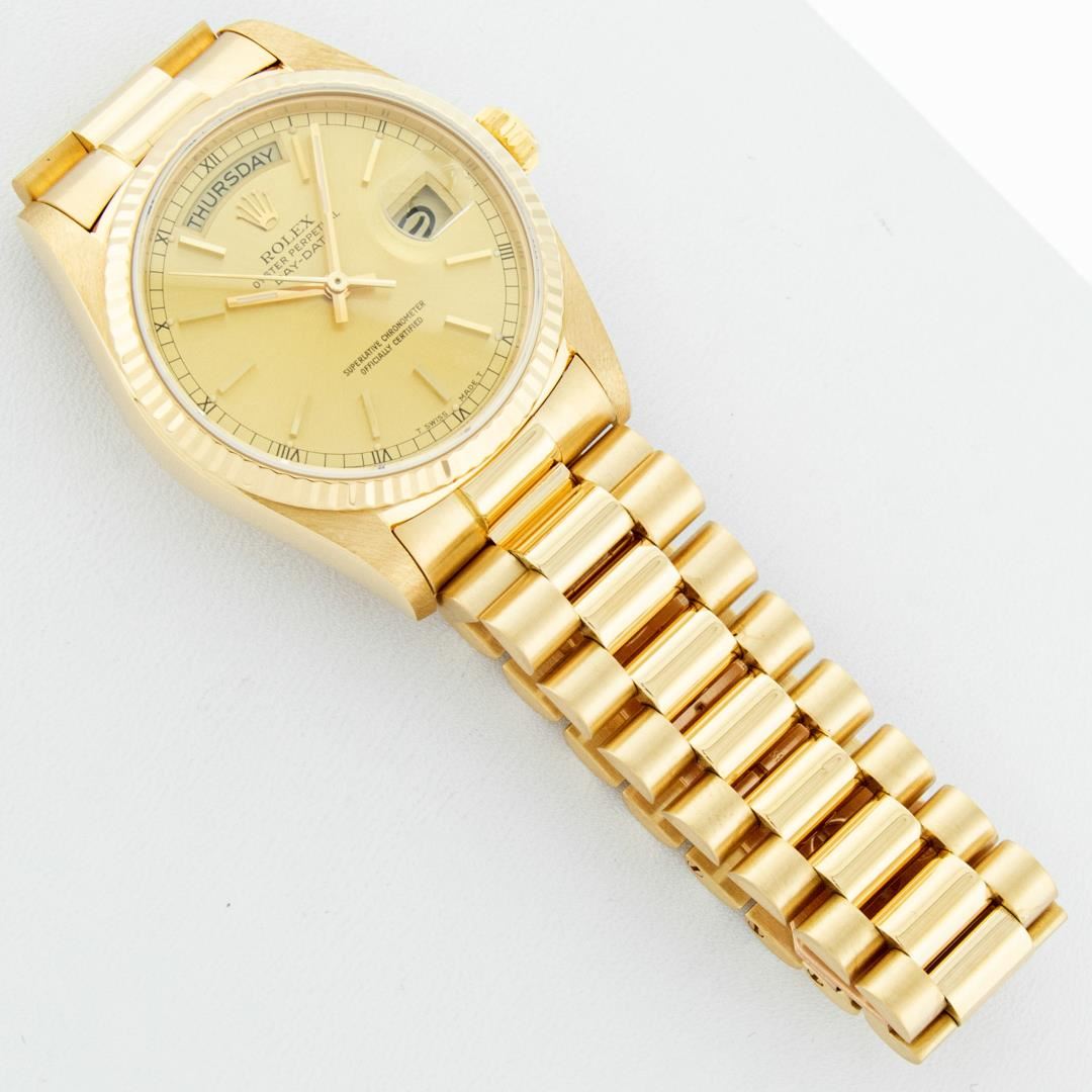 One Men's Quickset Rolex Day Date 18K Yellow Gold President Polished, Serviced & Electronically Tested, Rolex 18K Yellow Gold Case: 36mm, Rolex 18K Yellow Gold Crown, Rolex Bezel: 18K Yellow Gold Fluted Bezel. Crystal: Sapphire With Magnified Date Window. Hands: Luminescent Hands. Rolex Movement: Automatic Quickset Winding Movement Caliber 3055. Rolex Dial: Champagne Index With Roman Track & Lumi Dots. Date Window: 3 O'Clock Position, Day Display: 12 O'Clock Position, Single Quickset, Model: Day Date Quickset President. Condition: G-6 Extra Fine. Rolex Bracelet: 18K Yellow Gold President Band With Hidden Clasp, Bright & Satin Polish. 7.0 Inch Length, Standard Hidden President Clasp, With Rolex Logo. This Pre Owned Watch Has Been Serviced Time Tested And Is In Excellent Condition It Is Free Of All Scratches And Dents.