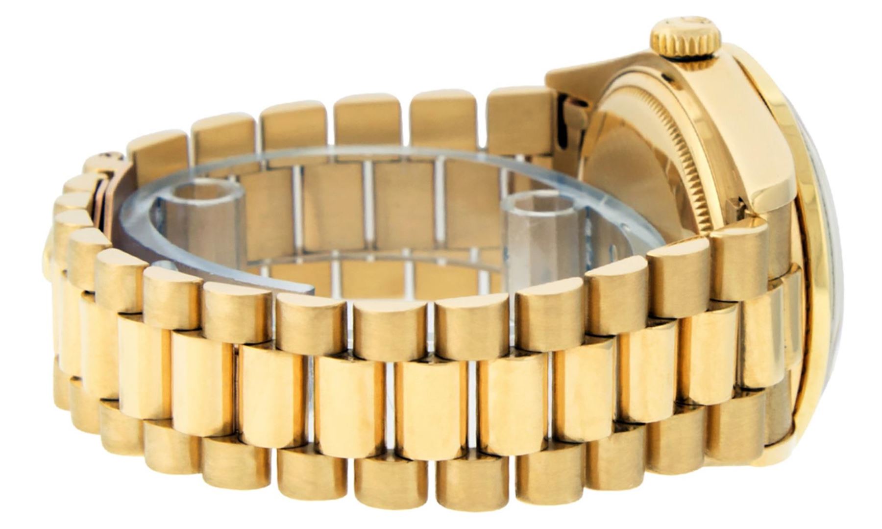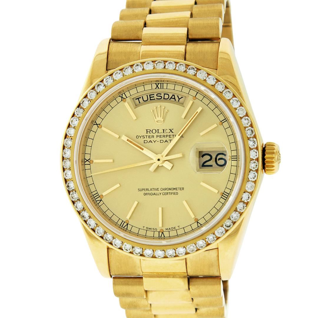 One Men's Rolex Day Date 18K Yellow Gold President Polished, Serviced & Electronically Tested, Rolex 18K Yellow Gold Case: 36mm, Rolex 18K Yellow Gold Crown, Custom Bezel: New 18K Yellow Gold Channel Set Diamond Bezel, Diamond Count: 54 Diamonds On Bezel. Total Bezel Weight 1.3 Carat, Clarity: SI-VS, Color: G to H. Custom Crystal: New Sapphire With Magnified Date Window. Hands: Luminescent Hands. Rolex Movement: Automatic Winding Movement Caliber 3055. Rolex Dial: Champagne Index With Square Roman Track And Lumi Dot. Date Window: 3 O'Clock Position Date Display, Day Window: 12 O'Clock Position Date Display. Quickset, Model: Day Date Quickset President. Condition: G-6 Extra Fine. Rolex Bracelet: 18K Yellow Gold President Band. Bright Polish. 7.0 Inch Length, Standard Hidden President Clasp, With Rolex Logo. This Pre Owned Watch Has Been Serviced Time Tested And Is In Excellent Condition It Is Free Of All Scratches And Dents.