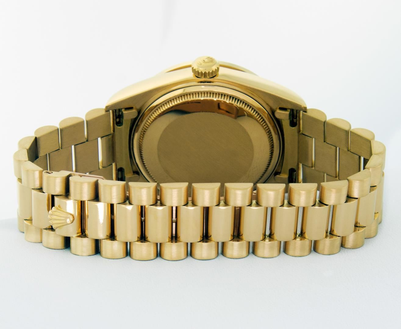 One Men's Quickset Rolex Day Date 18K Yellow Gold President Polished, Serviced & Electronically Tested, Rolex 18K Yellow Gold Case: 36mm, Rolex 18K Yellow Gold Crown, Custom Bezel: New 18K Yellow Diamond + Ruby Beadset Bezel, Stone Count: 36 Diamonds + 4 Rubies, Total Weight .75 Carat, Clarity: SI-VS, Color: G to H. Custom Crystal: New Sapphire With Magnified Date Window. Custom Hands: New Luminescent Hands. Rolex Movement: Automatic Quickset Winding Movement Caliber 3055. Rolex Dial: Factory Champagne Diamond Dial With Dash Track And Lumi Dots, Stone Count: 8 Diamonds + 2 Baguettes, Clarity: VS. Date Window: 3 O'Clock Position, Day Display: 12 O'Clock Position, Single Quickset, Model: Day Date Quickset President. Condition: G-6 Extra Fine. Rolex Bracelet: 18K Yellow Gold President Band With Hidden Clasp, Bright & Satin Polish. 7.0 Inch Length, Hidden President Clasp, With Rolex Logo. This Pre Owned Watch Has Been Serviced Time Tested And Is In Excellent Condition It Is Free Of All Scratches And Dents.