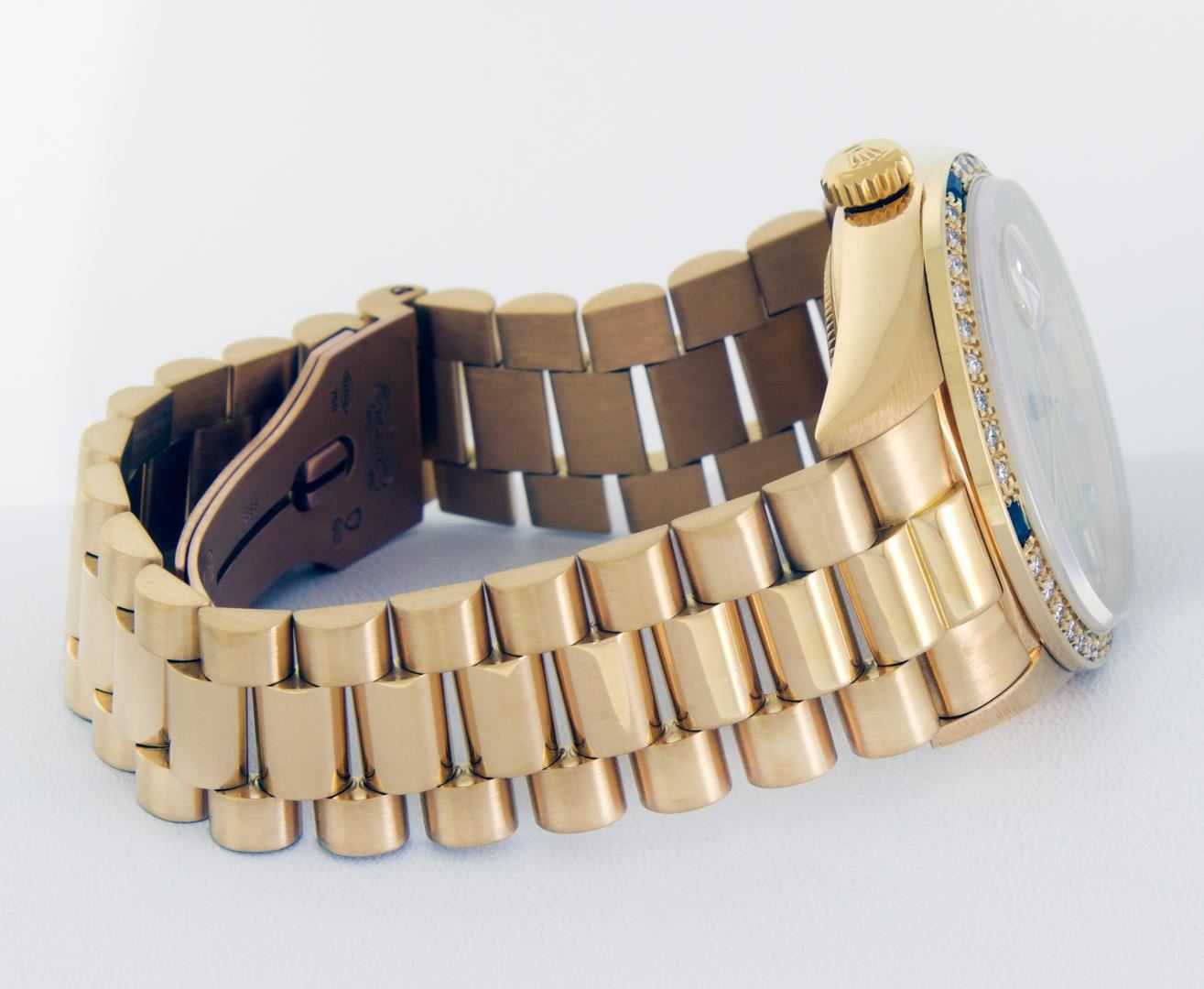 One Men's Quickset Rolex Day Date 18K Yellow Gold President Polished, Serviced & Electronically Tested, Rolex 18K Yellow Gold Case: 36mm, Rolex 18K Yellow Gold Crown, Custom Bezel: New 18K Yellow Diamond + Sapphire Beadset Bezel, Stone Count: 36 Diamonds + 4 Sapphires, Total Weight .75 Carat, Clarity: SI-VS, Color: G to H. Custom Crystal: New Sapphire With Magnified Date Window. Custom Hands: New Luminescent Hands. Rolex Movement: Automatic Quickset Winding Movement Caliber 3055. Rolex Dial: Factory Champagne Diamond Dial With Dash Track And Lumi Dots, Stone Count: 8 Diamonds + 2 Baguette Diamonds, Clarity: VS. Date Window: 3 O'Clock Position, Day Display: 12 O'Clock Position, Single Quickset, Model: Day Date Quickset President. Condition: G-6 Extra Fine. Rolex Bracelet: 18K Yellow Gold President Band With Hidden Clasp, Bright & Satin Polish. 7.0 Inch Length, Standard Hidden President Clasp, With Rolex Logo. This Pre Owned Watch Has Been Serviced Time Tested And Is In Excellent Condition It Is Free Of All Scratches And Dents.