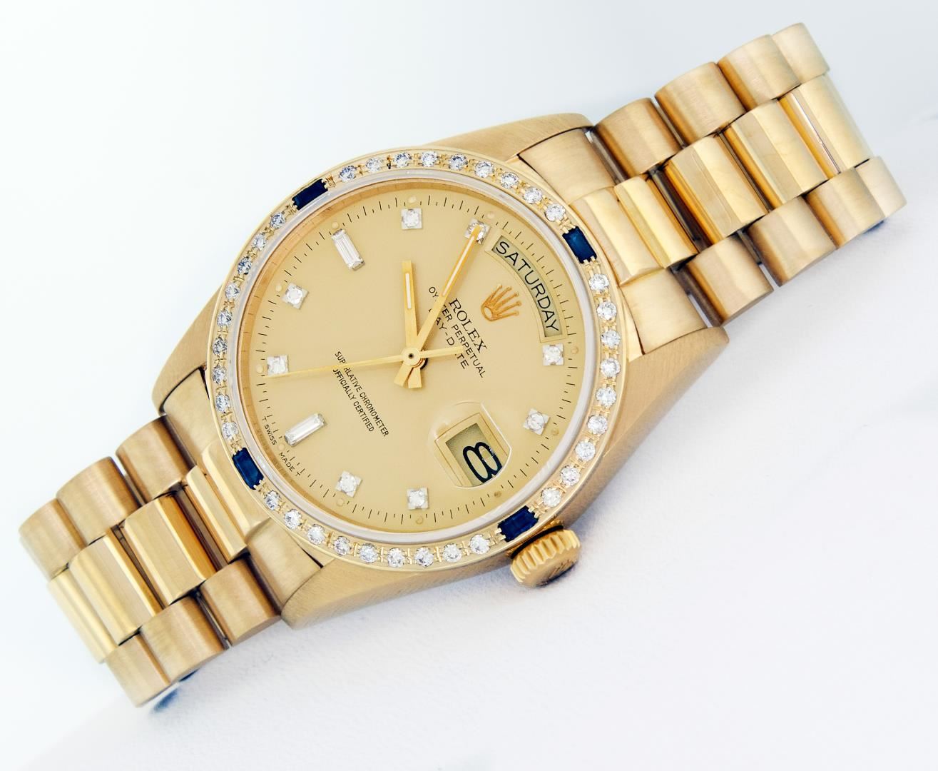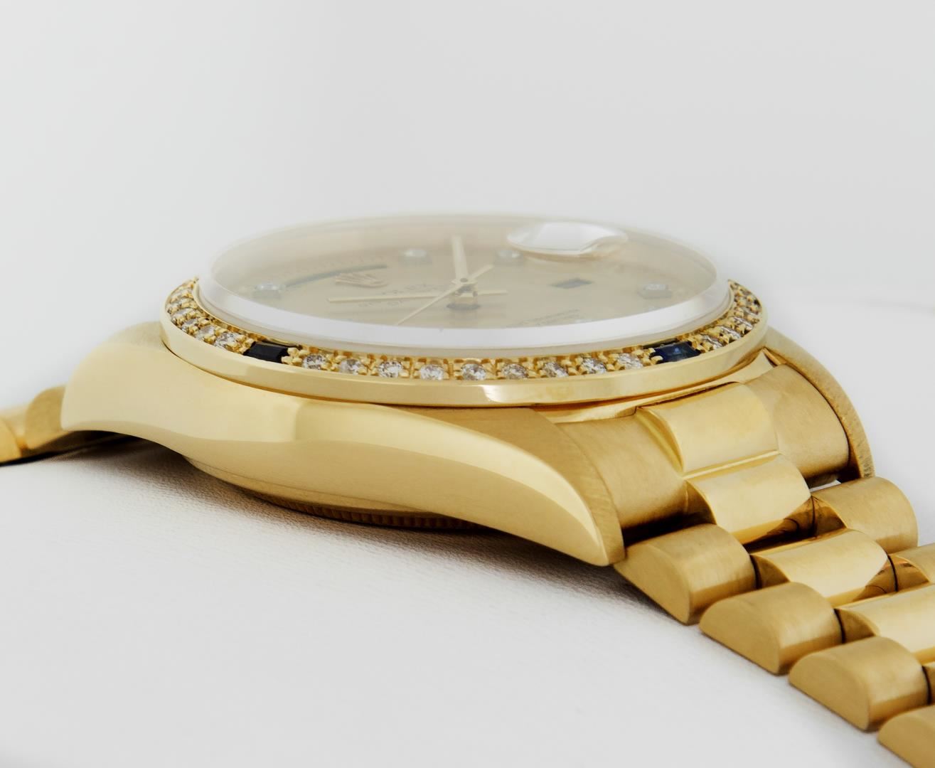 One Men's Quickset Rolex Day Date 18K Yellow Gold President Polished, Serviced & Electronically Tested, Rolex 18K Yellow Gold Case: 36mm, Rolex 18K Yellow Gold Crown, Custom Bezel: New 18K Yellow Diamond + Sapphire Beadset Bezel, Stone Count: 36 Diamonds + 4 Sapphires, Total Weight .75 Carat, Clarity: SI-VS, Color: G to H. Custom Crystal: New Sapphire With Magnified Date Window. Custom Hands: New Luminescent Hands. Rolex Movement: Automatic Quickset Winding Movement Caliber 3055. Rolex Dial: Factory Champagne Diamond Dial With Dash Track And Lumi Dots, Stone Count: 8 Diamonds + 2 Baguette Diamonds, Clarity: VS. Date Window: 3 O'Clock Position, Day Display: 12 O'Clock Position, Single Quickset, Model: Day Date Quickset President. Condition: G-6 Extra Fine. Rolex Bracelet: 18K Yellow Gold President Band With Hidden Clasp, Bright & Satin Polish. 7.0 Inch Length, Standard Hidden President Clasp, With Rolex Logo. This Pre Owned Watch Has Been Serviced Time Tested And Is In Excellent Condition It Is Free Of All Scratches And Dents.