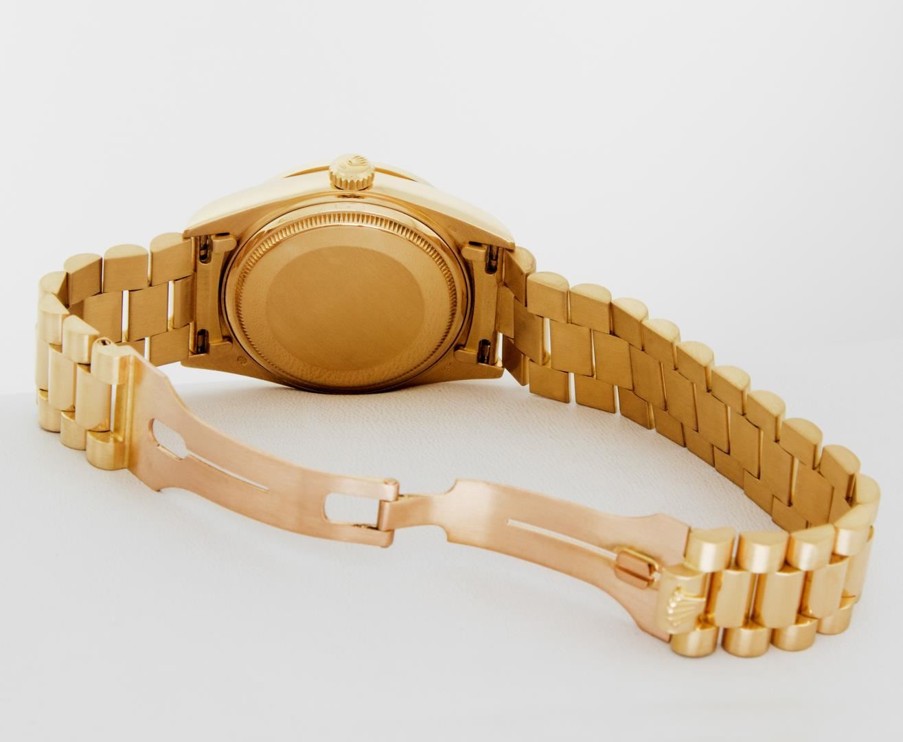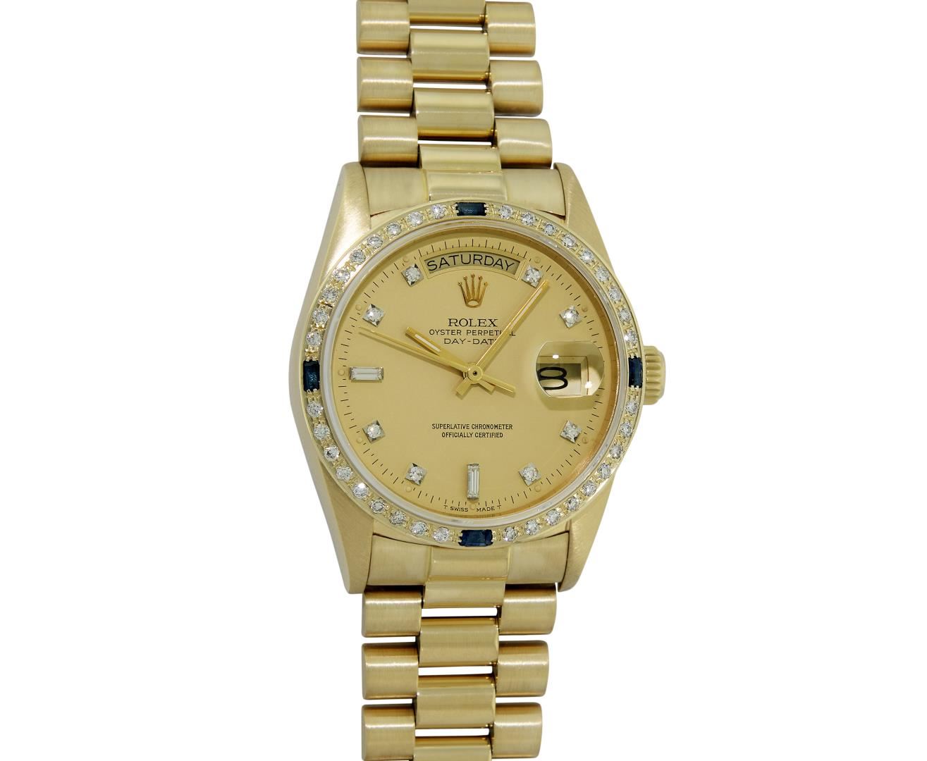 One Men's Quickset Rolex Day Date 18K Yellow Gold President Polished, Serviced & Electronically Tested, Rolex 18K Yellow Gold Case: 36mm, Rolex 18K Yellow Gold Crown, Custom Bezel: New 18K Yellow Diamond + Sapphire Beadset Bezel, Stone Count: 36 Diamonds + 4 Sapphires, Total Weight .75 Carat, Clarity: SI-VS, Color: G to H. Custom Crystal: New Sapphire With Magnified Date Window. Custom Hands: New Luminescent Hands. Rolex Movement: Automatic Quickset Winding Movement Caliber 3055. Rolex Dial: Factory Champagne Diamond Dial With Dash Track And Lumi Dots, Stone Count: 8 Diamonds + 2 Baguette Diamonds, Clarity: VS. Date Window: 3 O'Clock Position, Day Display: 12 O'Clock Position, Single Quickset, Model: Day Date Quickset President. Condition: G-6 Extra Fine. Rolex Bracelet: 18K Yellow Gold President Band With Hidden Clasp, Bright & Satin Polish. 7.0 Inch Length, Standard Hidden President Clasp, With Rolex Logo. This Pre Owned Watch Has Been Serviced Time Tested And Is In Excellent Condition It Is Free Of All Scratches And Dents.