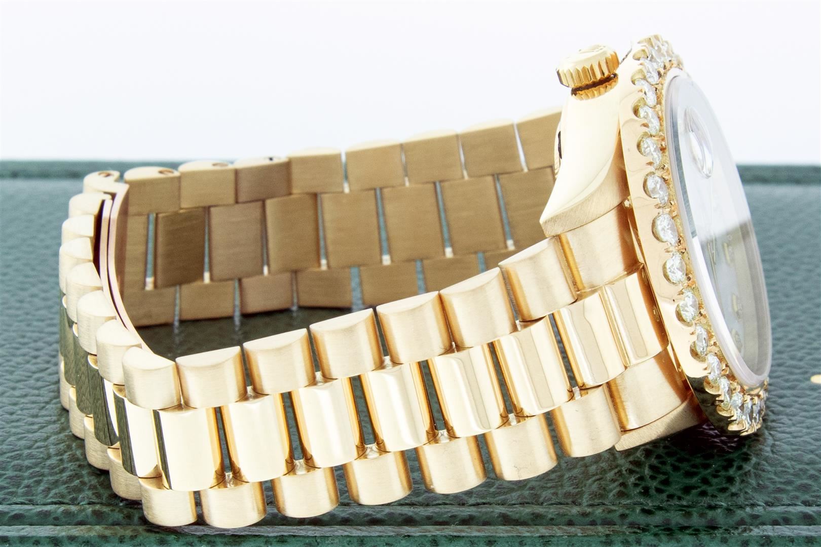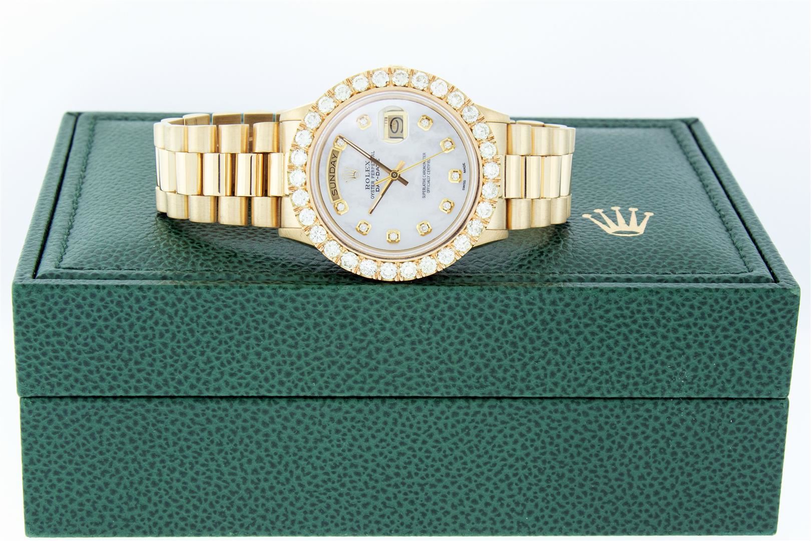 One Men's Rolex Day Date 18K Yellow Gold President Polished, Serviced & Electronically Tested, Rolex 18K Yellow Gold Case: 36mm, Rolex 18K Yellow Gold Crown, Custom Bezel: New 18K Yellow Gold Bead-set Diamond Bezel, Diamond Count: 48 Diamonds On Bezel. Total Weight 4.25 Carat, Clarity: SI-VS, Color: G to H. Custom Crystal: New Sapphire With Magnified Date Window. Custom Hands: New Luminescent Hands. Rolex Movement: Automatic Winding Movement. Custom Dial: Mother Of Pearl With Custom Added Diamond Hour Markers, Diamond Count: 10 Diamonds On Dial, Color: G to H, Clarity:VS. Date Window: 3 O'clock Position Date Display, Day Window: 12 O'clock Position Date Display. Quickset, Model: Day Date President. Condition: G-6 Extra Fine The Watch Is In Very Good Condition Free Of All Scratches And Dents. Rolex Bracelet: 18K Yellow Gold President. Bright Polish. 7.0 Inch Length, Standard Hidden President Clasp President Band, With Rolex Logo. This Pre Owned Watch Has Been Serviced And Polished It Is Free Of All Scratches And Dents. This Watch Comes With A Rolex Box.