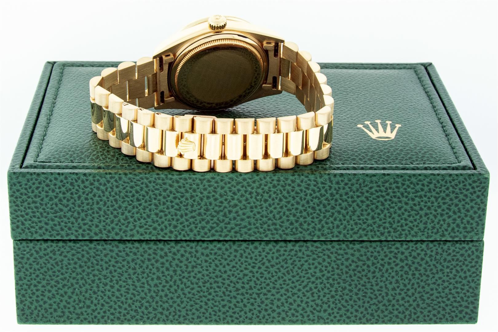 One Men's Rolex Day Date 18K Yellow Gold President Polished, Serviced & Electronically Tested, Rolex 18K Yellow Gold Case: 36mm, Rolex 18K Yellow Gold Crown, Custom Bezel: New 18K Yellow Gold Pyramid Beadset Diamond Bezel, Diamond Count: 24 Diamonds On Bezel. Total Weight 1.00 Carat, Clarity: SI-VS, Color: G to H. Custom Crystal: New Sapphire With Magnified Date Window. Rolex Movement: Automatic Winding Movement. Custom Dial: MOP Diamond Dial, Diamond Count: 10 Diamonds On Dial, Color: G to H, Clarity: SI-VS. Date Window: 3 O'clock Position Date Display, Day Window: 12 O'clock Position Date Display. Quickset, Model: Day Date President. Condition: G-6 Extra Fine. Rolex Bracelet: 18K Yellow Gold President Band. Bright Polish. 7.0 Inch Length, Standard Hidden President Clasp President Band, With Rolex Logo. This Pre Owned Watch Has Been Serviced And Polished It Is Free Of All Scratches And Dents. This Watch Comes With A Rolex Box.